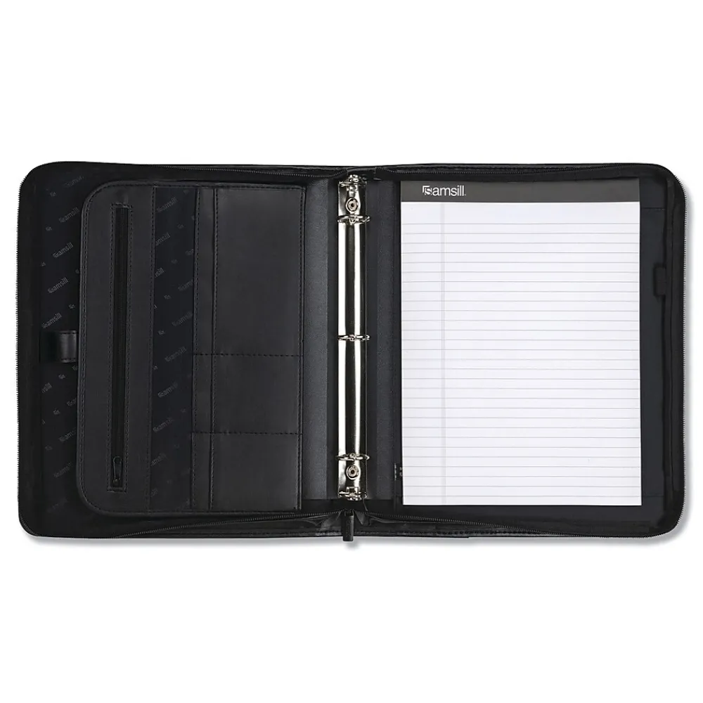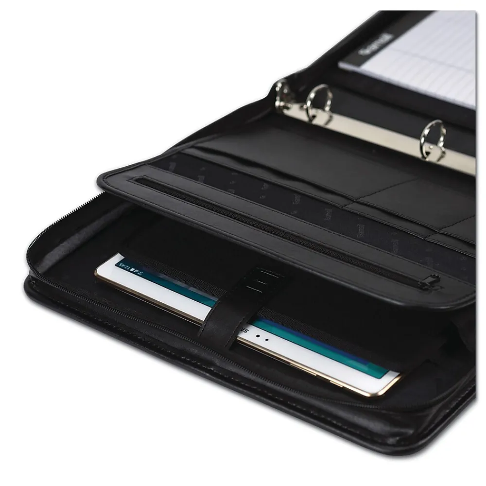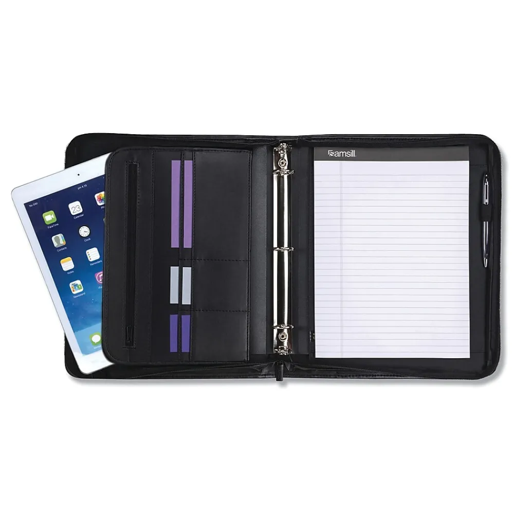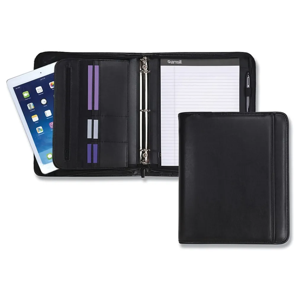 After considering the needs of modern-day professionals, we, at Samsill, are happy to say that we’ve come up with an organizer to make your life at work more comfortable and stylish, all thanks to our well-received Samsill Professional Binder Padfolio. Flaunt a smart look wherever you go with this stylish Professional Ring Binder Portfolio with Zippered Closure Case. A perfect companion to your flourishing business life, this briefcase-style portfolio offers utmost sophistication and style while it also helps you stay organized for all the important moments in your life. To put it simply, it’s the only pad folio you’ll ever need. It uses synthetic leather that carries the feel and look of premium Napa Leather to help you make a positive and lasting first impression. Its minimalist design is a perfect fit for all environments – from Fortune 500 boardrooms to university classrooms. Safety first! The business portfolio is designed with a smart zip-around closure that ensures complete safety of all your gadgets, documents, and other business accessories kept inside. Carrying your tablet along? No problem! Our business portfolio includes a 10.1-inch built-in padded tablet sleeve that can hold most tablets out there Stay organized while the exterior has two large storage pockets, it opens to reveal an inside document pocket, business card pockets, and accessory pockets. This business case is equipped with a 1-inch round ring that can comfortably hold up to 225 paper sheets. The expandable document pocket helps you store anything and everything from loose pages, letters & envelopes to leaflets, invites and personal IDs. Wand to take some quick notes? We’ve got you covered with a refillable letter-sized writing pad and a pen loop.