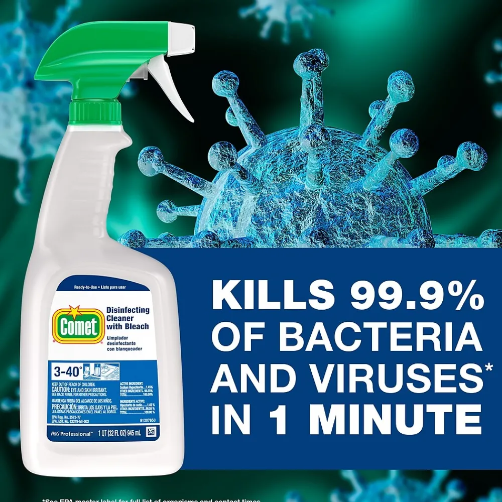 - Comet spray cleans and disinfects in one step when used per label instructions