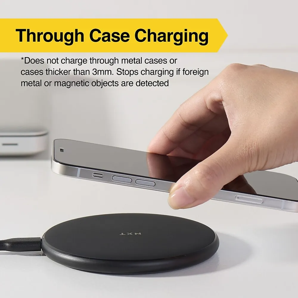 - Note: Does not charge through metal cases or cases thicker than 3 mm. Stops charging if foreign metal or magnetic objects are detected.