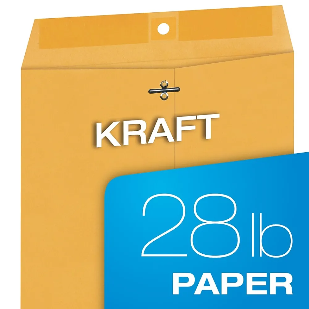 Use these brown gummed clasp envelopes to keep mail safe while in storage or transit. The sturdy metal clasp holds contents securely inside and lets you reuse these envelopes. The moisture activated seal with deep gumming on the flap creates a permanent seal when needed. These 9 x 12-inch envelopes come with 100 units per box and are constructed with 28-pound kraft stock to protect against rips, tears, punctures, and moisture.