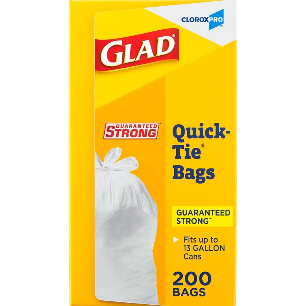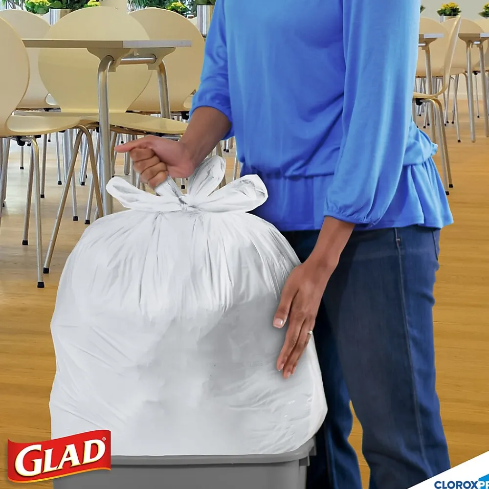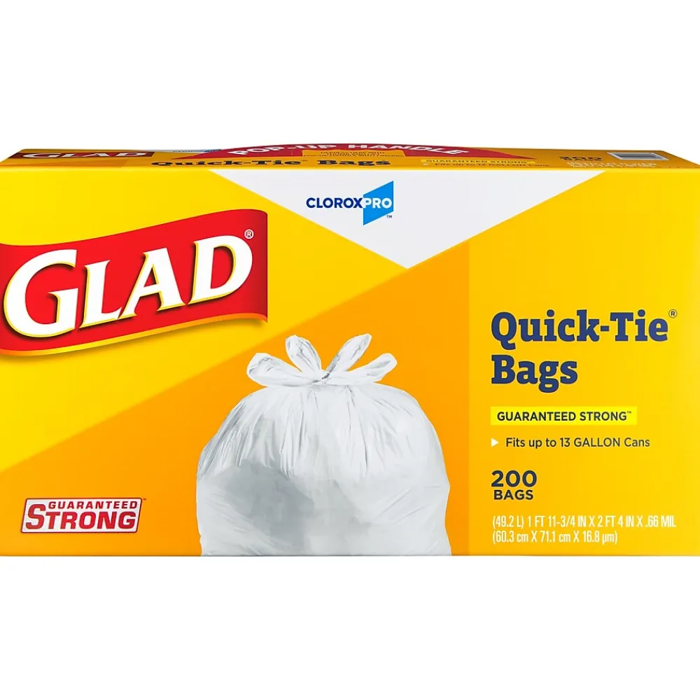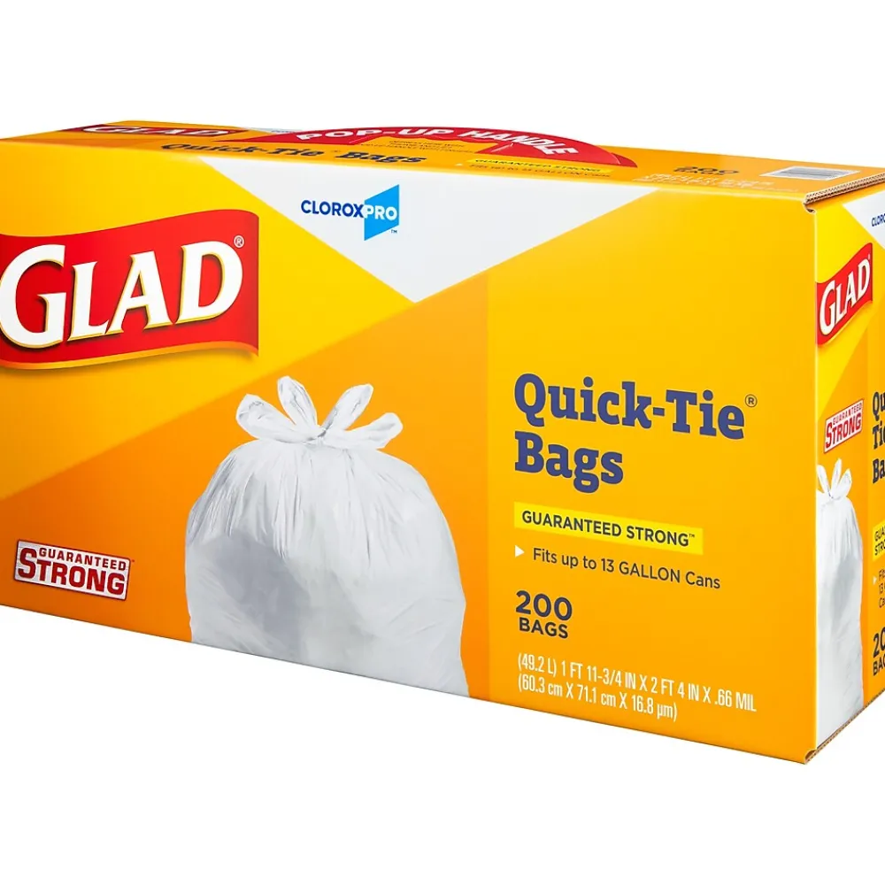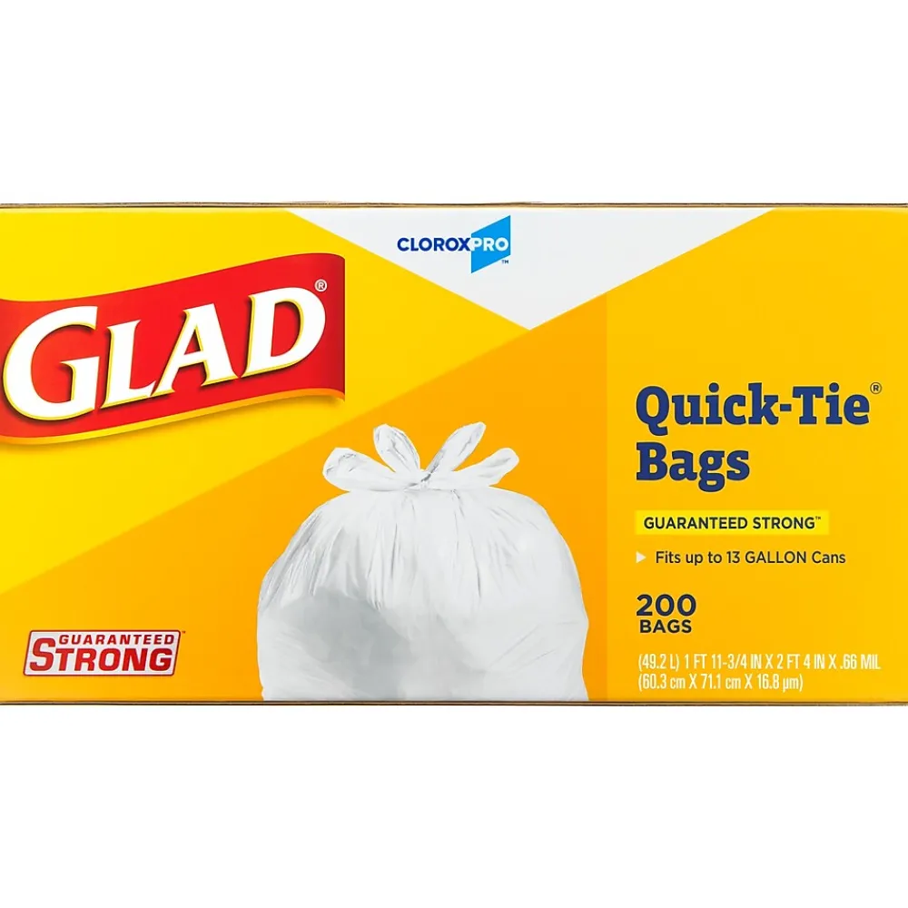 Made with 3 ply strength, the Glad CloroxPro Quick-Tie Tall Kitchen Trash Bags are strong and sturdy for all your commercial needs. The Quick-Tie strong and dependable built in flaps provide easy closure for your big trash loads. The easy tie flaps help keep the bag securely shut to avoid messy trash disasters as you transport it. No need for inconvenient twist ties that can be misplaced; just close the bag by cross tying the handles and you’re done. You can transport even the fullest garbage bag without any worries of spillage. Also, the 13 gallon size is great for a variety of uses around your home or office, like storing and protecting toys, blankets, linens, clothes or covering furniture, lining a litter box, or even use as a laundry bag. Ideal for use in schools, daycare centers, restaurants, hotels, and other commercial facilities. For your toughest trash needs and seasonal cleaning, trust Glad.