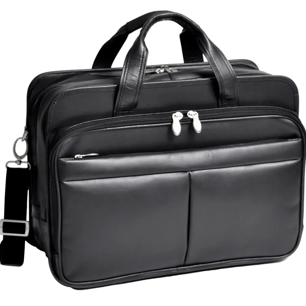 Briefcase with front organizer with storage space for media devices, cell phone, business cards, key holder and pens. Front compartment features file divider that expands 2″ to allow 3% more storage space. Back compartment holds a detachable laptop sleeve padded with high-density foam to protect laptops up to 17″ in size. Front zipper pocket for small miscellaneous items. Smart Zipper Attachment allows easy attachment on extended handles of other rolling cases and luggage. Removable shoulder strap included.