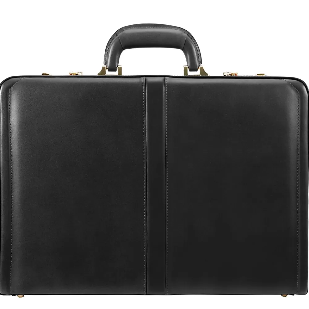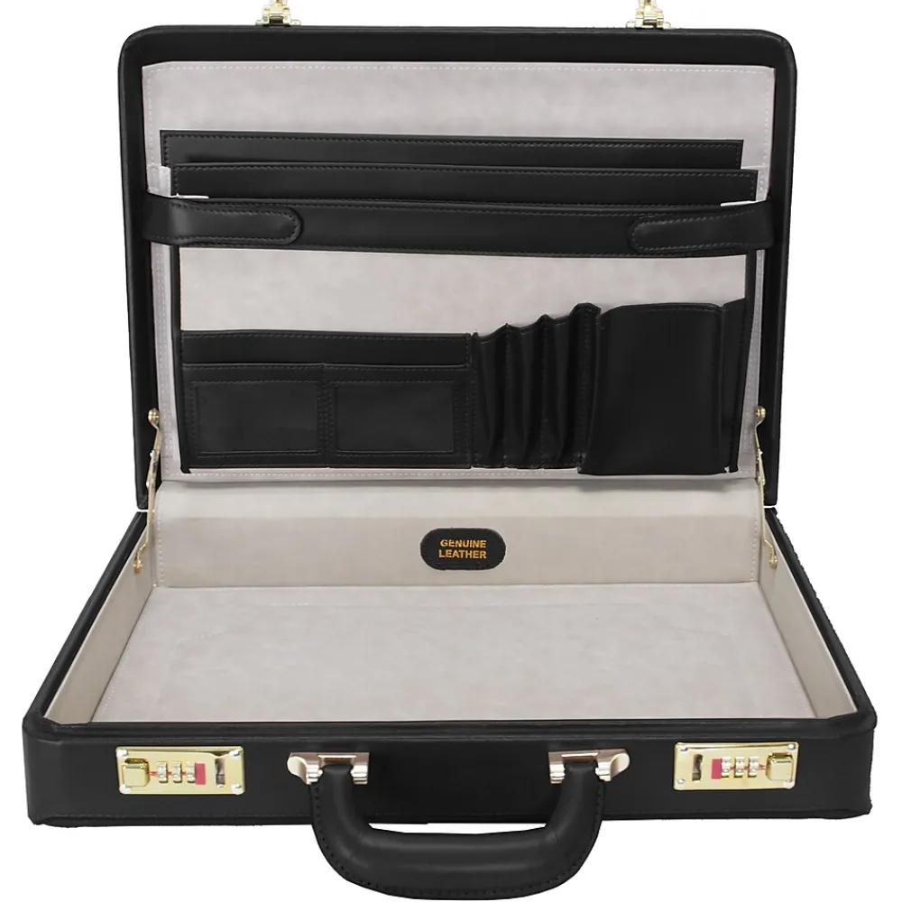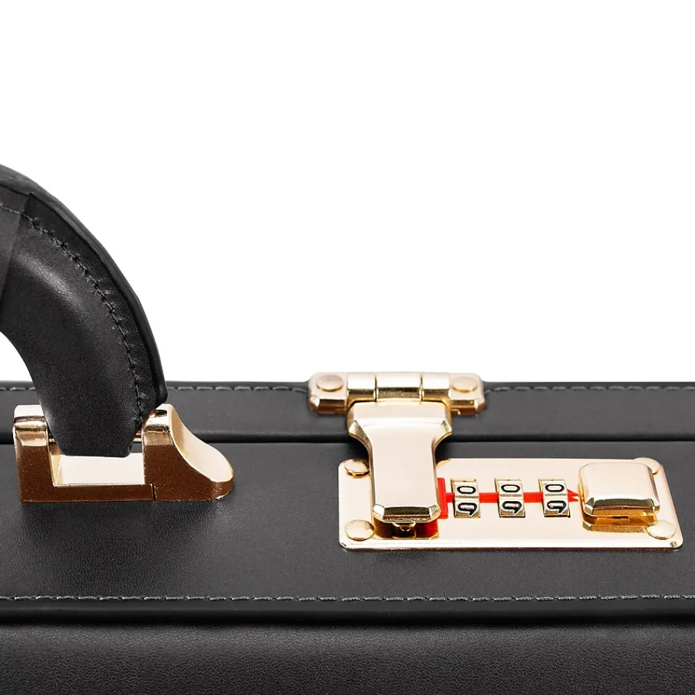 Slim design briefcase. 3-digit combination lock for added security. Gold-finished hardware. Comfortable top carry handle. Protective feet keeps case from falling over. Includes Tablet Pocket.