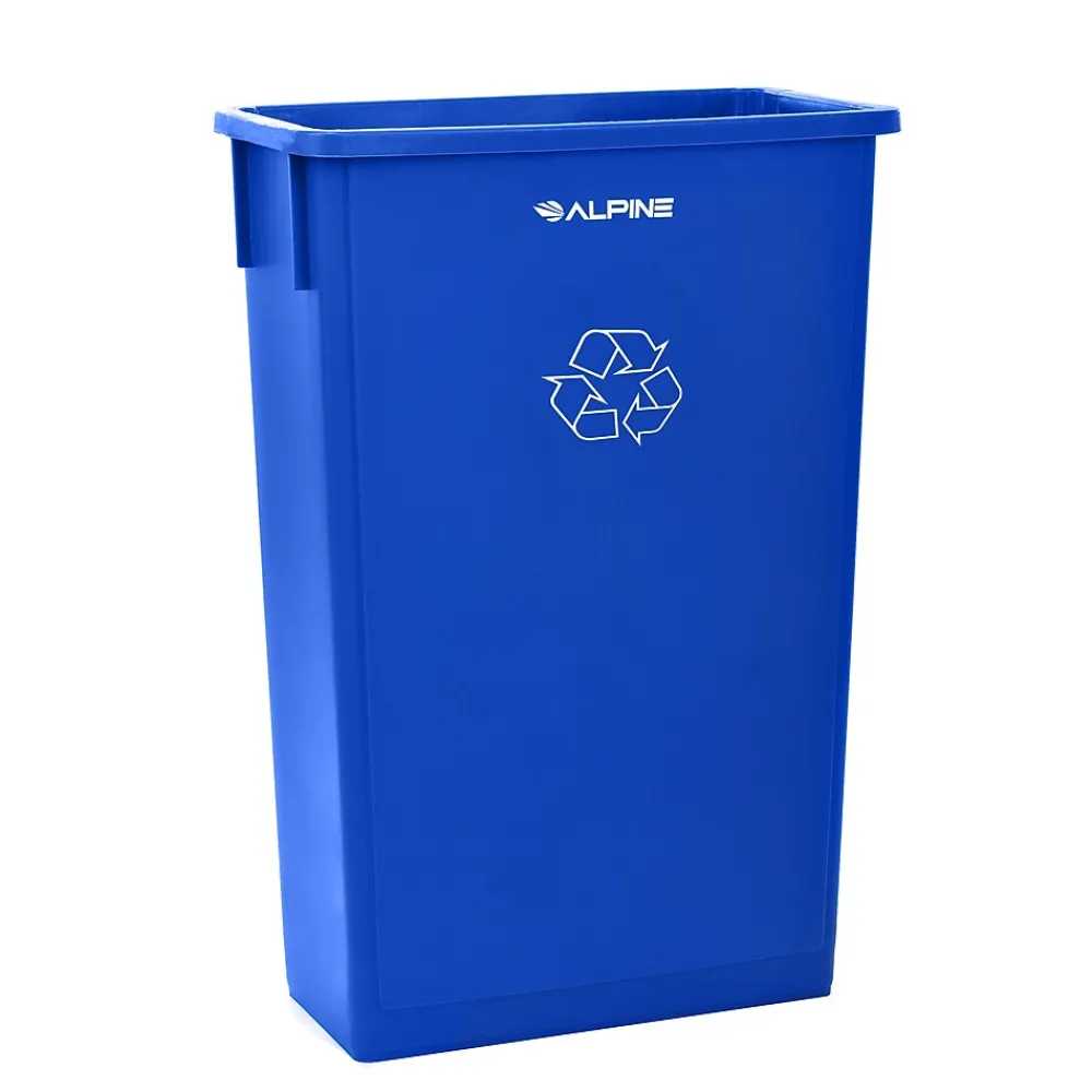 Alpine Industries 23 Gallon Blue Slim Recycle Bin stylish and compact, making it easy to fit into any office or commercial space. This gray trash can features a large and clear black print label, making it a noticeable trash disposal solution even from far away. The lid is designed to insert paper, envelopes and the like. Use to recycle or hide rubbish with this 1 slot lid. The trash can and lid are conveniently designed for function and can handle a beating.
