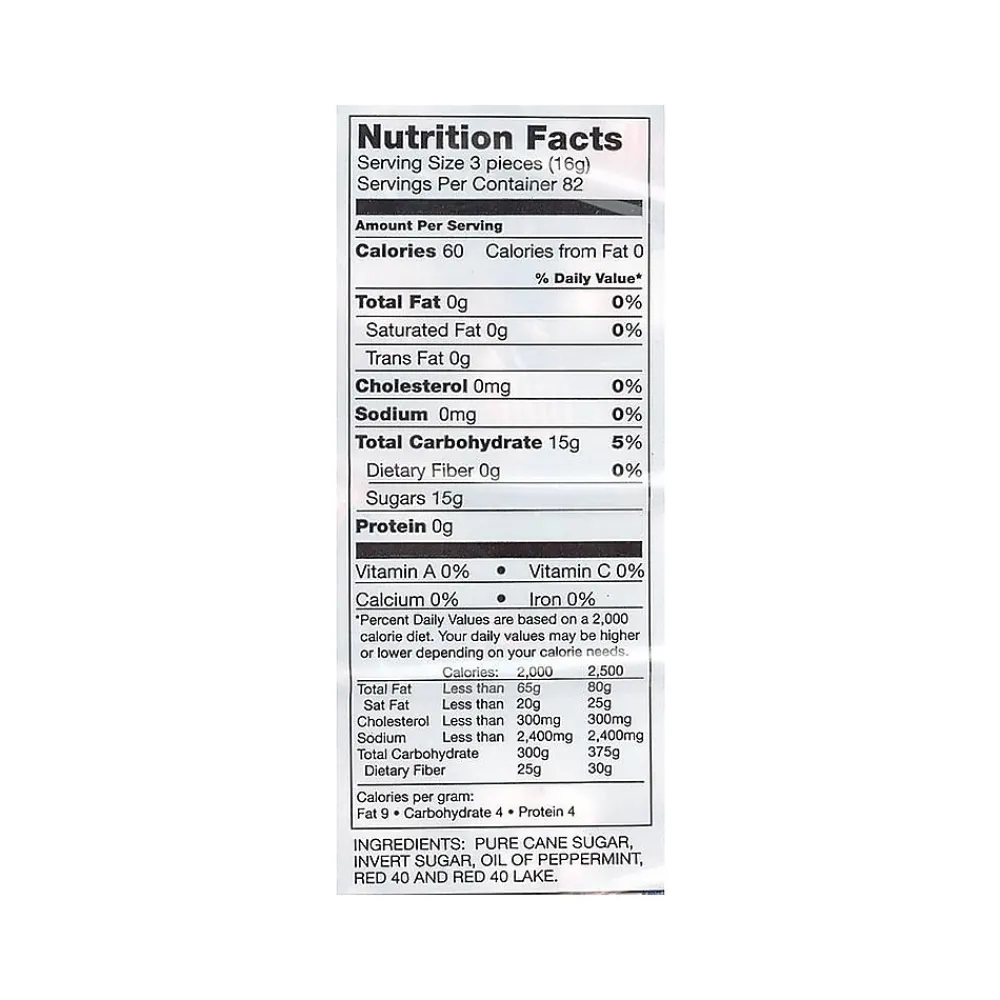 - Made of pure cane sugar, invert sugar, peppermint oil, Red 40, and Red 40 Lake