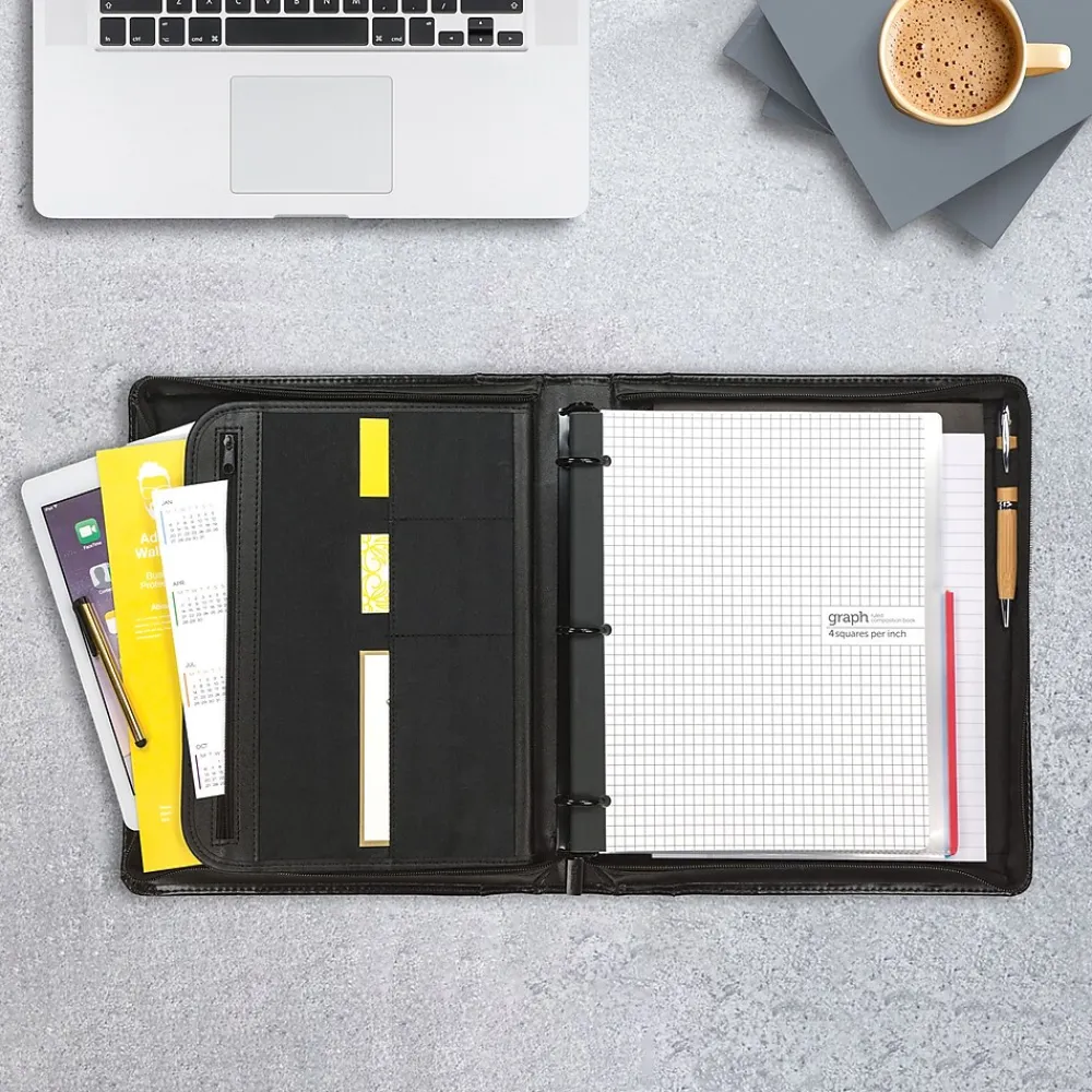 Each executive padfolio with zippered closure gives you the clean yet stylish look with rich black leather exterior and internal lining. Smartly designed for the ultimate in functionality and convenience for both men and women. Includes softly lined tablet sleeve with hook and loop closure that is perfect for 9 inch and 10.1 inch tablets including iPad, iPad Air, Samsill Galaxy, Amazon Fire, Dell Venue, and Google Nexus. Interior is packed with pockets for storing extra documents, business cards, and other business essentials. 1 inch ring binder for organizing documents. Includes letter size 8.5″ x 11″ writing pad that adapts for left handed and right handed use. Pen loop. Perfect zipper pad holder ring binder any professional wanting to look the part.