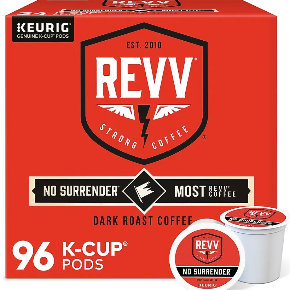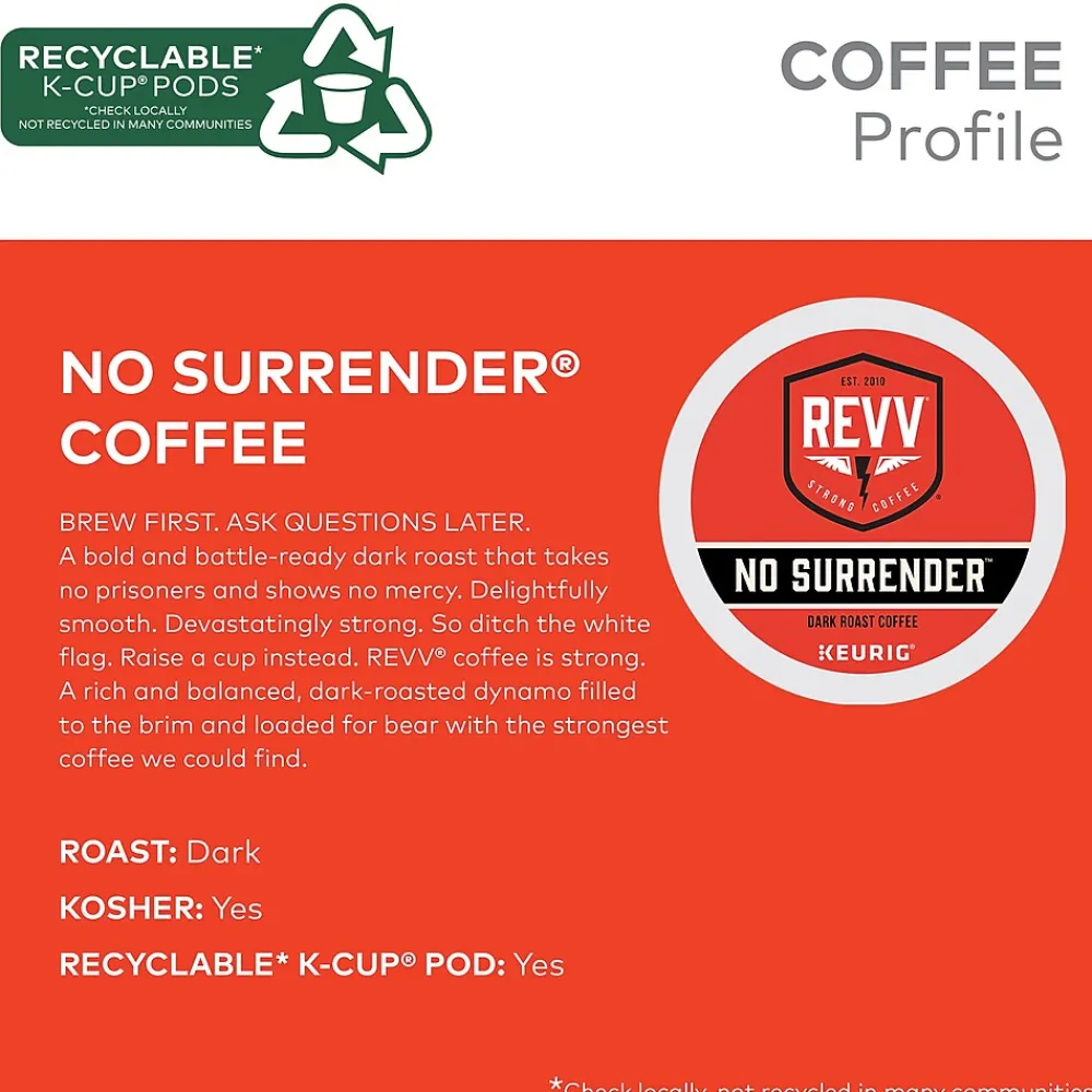 Brew first. Ask questions later. Deep. Bold. Smooth. A bold and battle-ready dark roast that takes no prisoners and shows no mercy. Delightfully smooth. Devastatingly strong. So ditch the white flag. Raise a cup instead. The Revv Coffee No Surrender is strong coffee. Like, really strong. Good-morning-kiss-from-a-jackhammer strong. In other words, it’s just what you need. Drop one in your Keurig brewer, deep-six your forty winks, and join the Revolution. A rich and balanced, dark-roasted dynamo filled to the brim and loaded for bear with the strongest coffee Revv Coffee could find. Packed with specialty-grade coffee, the single-serve Revv Coffee K-Cup pod is compatible with all Keurig K-Cup pod single-serve coffee makers. The pod is filled with the freshest ground coffee and brews a perfect, great-tasting cup of coffee, every time.