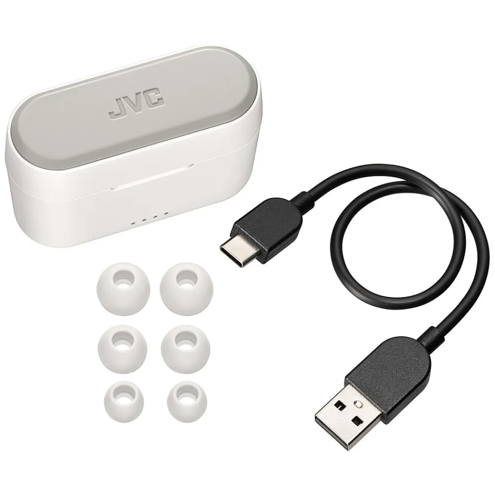 The White JVC RIPTIDZ True Wireless Earbuds with their cool 2-tone color design use Bluetooth 5.1 technology for a dependable connection and high-quality sound. Touch sensors provide simple and smart operation. These wireless earbuds come with a compact charging case, delivering up to 30 hours of playback. A quick 15-minute charge provides 90 minutes for music and movies. The Bluetooth earbuds are also waterproof IPX5 rated. Several sizes of earbud tips are provided. If the size of the earbud tips does not match the size of your ear canals or the earbuds are not worn properly in your ears, you may not obtain the correct sound qualities or call performance. In that case, change the earbud tips to ones that fit more snugly in your ears.