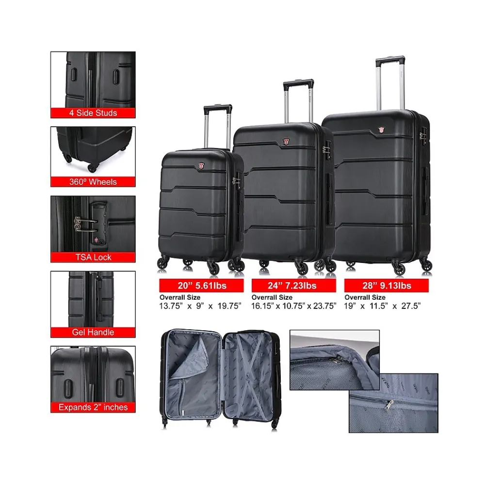 The hard-flex construction of this DUKAP RODEZ luggage set offers maximum strength, durability, and a water-/scratch-resistant finish. It features a full interior fabric lining with a zipper compartment on one side and snap-on straps on the opposite side for easy packing, plus one inside pocket for your convenience.