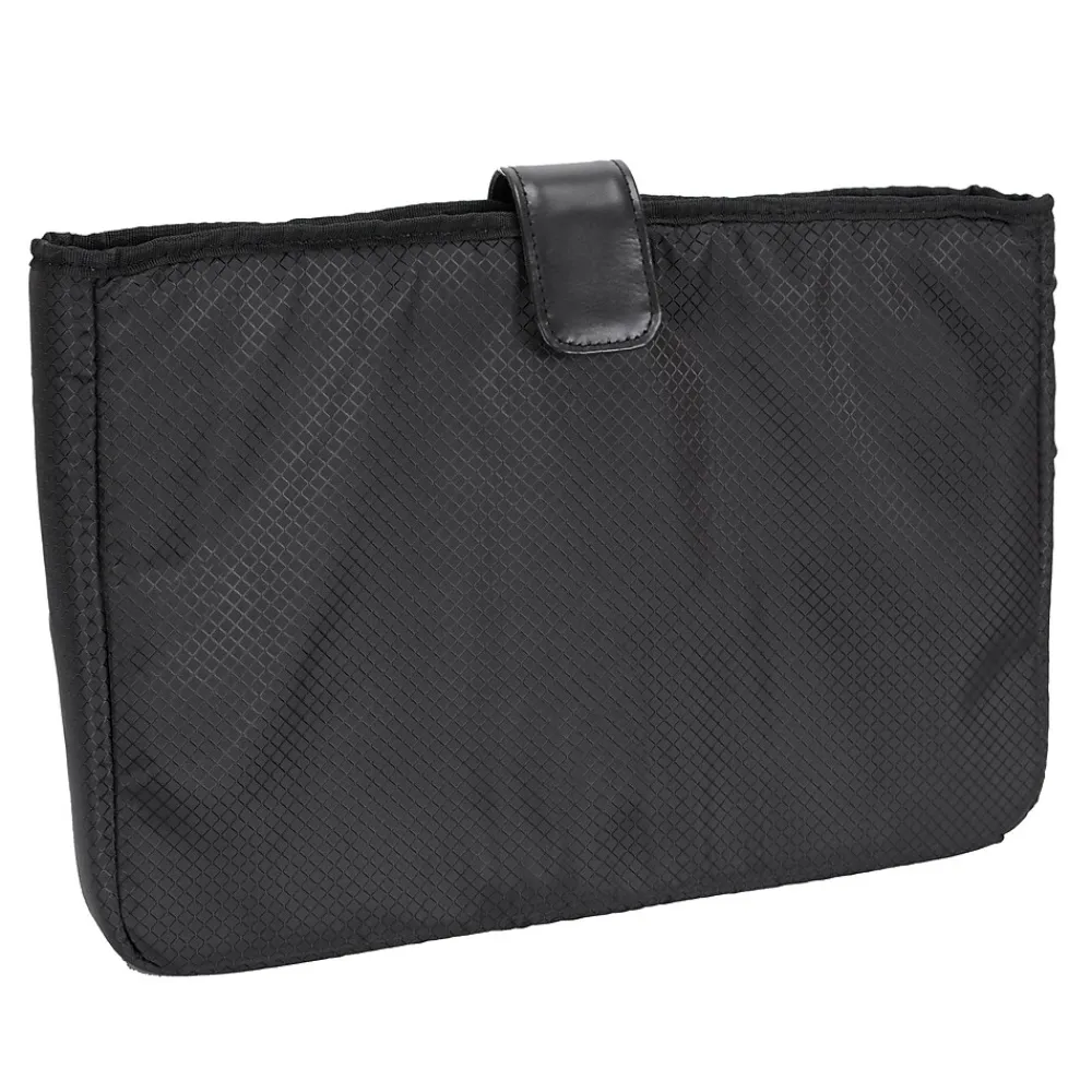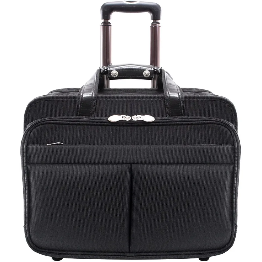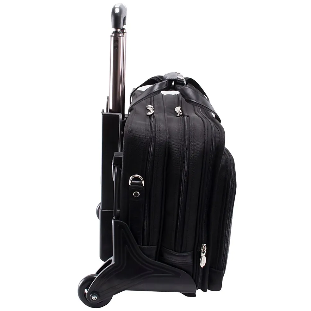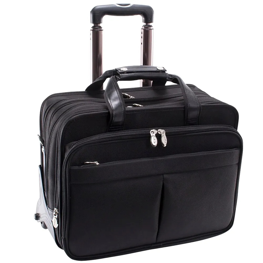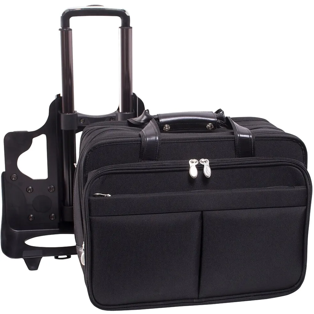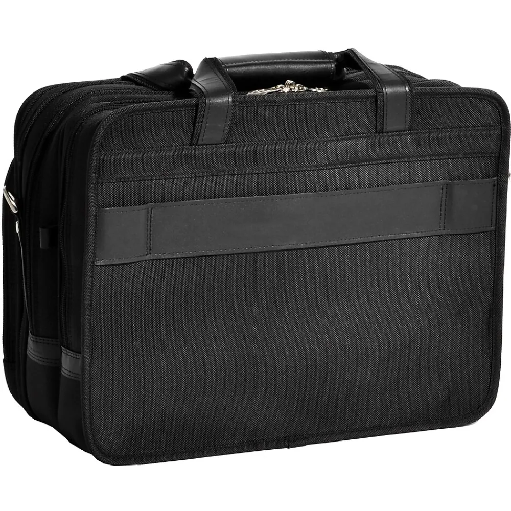 Patented 2-in-1 Detachable Wheel and Handle System briefcase. Front zipper pocket for small miscellaneous items. Front organizer pocket for media devices, cell phone, business cards, key holder and pens. Front compartment features a 3-file divider that expands 2″ to allow 3% more space. Back compartment with 3 accessory pouches features a 17″ Dual Laptop Protection System with removable sleeve included. Removable shoulder strap and weather proof cover included.