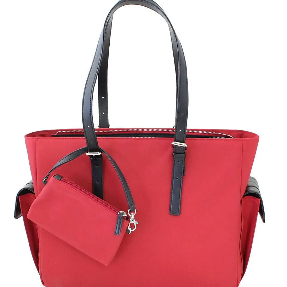 This lightweight, water-resistant microfiber bag boasts a structured, user-friendly design. The Francine Collections Slim Liberator Laptop Tote features a spacious main compartment with a padded laptop computer section and plenty of room for your accessories, files, and personal belongings. Its interior contains pockets and pouches for organizing your power cords, electronic devices, cosmetics, office supplies, and other small necessities; and side pockets provide quick access to your cell phone.
