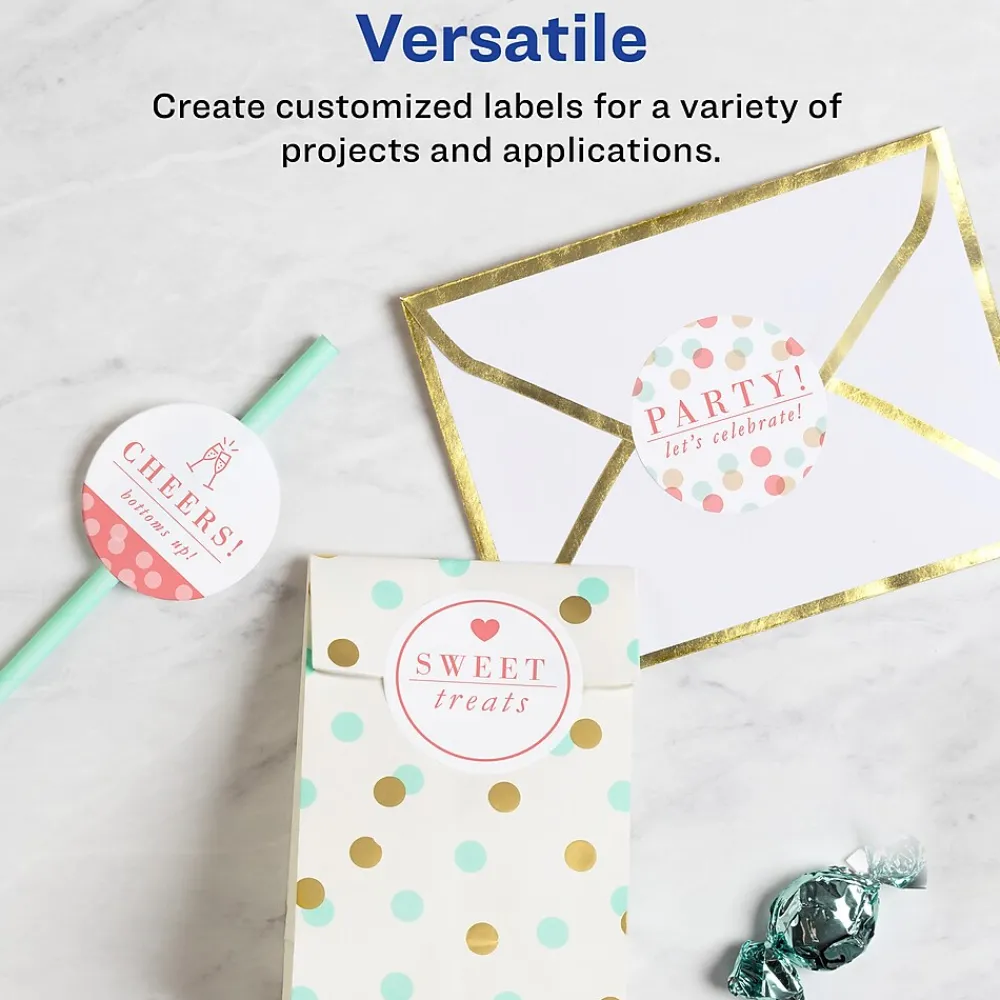 Make sure your handmade gifts and products stand out with Avery glossy round labels that offer the professional finishing touch you need. Our print-to-the-edge capability allows you to create bright, eye-catching full bleed labels with sharp text and crisp images printed right to the edge of the round sticker label with no border or margin. Sure Feed(R) technology which helps deliver a more reliable feed through your printer to prevent print misalignments and paper jams. Our round printable stickers are quick and easy to apply with our patented Easy Peel label sheets with Pop-up Edge. Simply fold the sheet back to display the label edges for convenient and fast peeling that saves time and avoids label waste. A strong permanent adhesive is used to make sure that these labels stick and stay to paper, cardboard, plastic, glass, metal and more, without curling or falling off. Compatible with both laser and inkjet printers. Avery Design & Print makes it easy to create customized labels from your own home or business. The free browser-based software has everything you need to design food and beverage labels, thank you stickers, party favor labels and labels for events, candles, body care products and more. Try it out today at avery.com/templates.