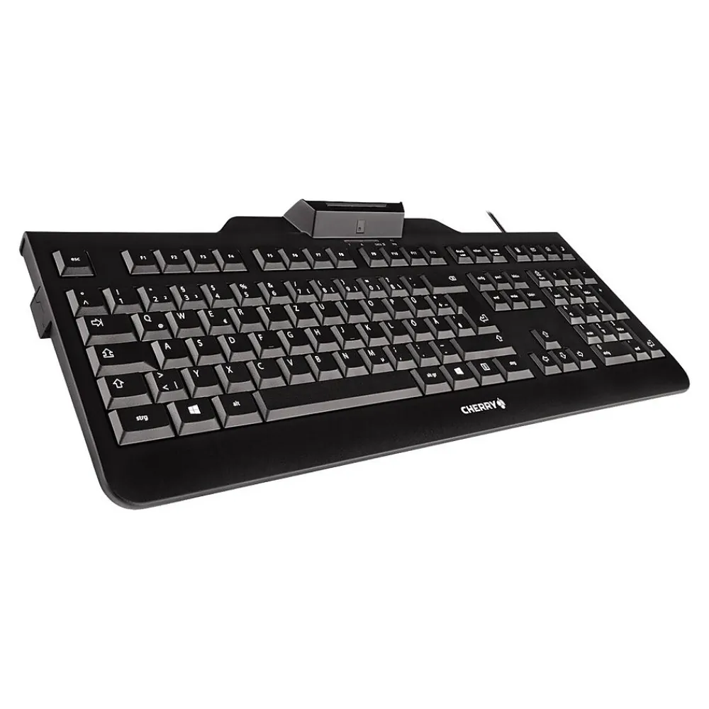 The Cherry black USB wired keyboard with integrated PCSC and EMV compatible smart card reader features secured PIN entry. It comes with full size 104 US key layout featuring EURO symbol. It comes with driver support for Windows/MacOS-X/Linux operating system and offers single-handed operation of smart card module. This keyboard is FIPS 201 and EMV 2000 level 1 approved.