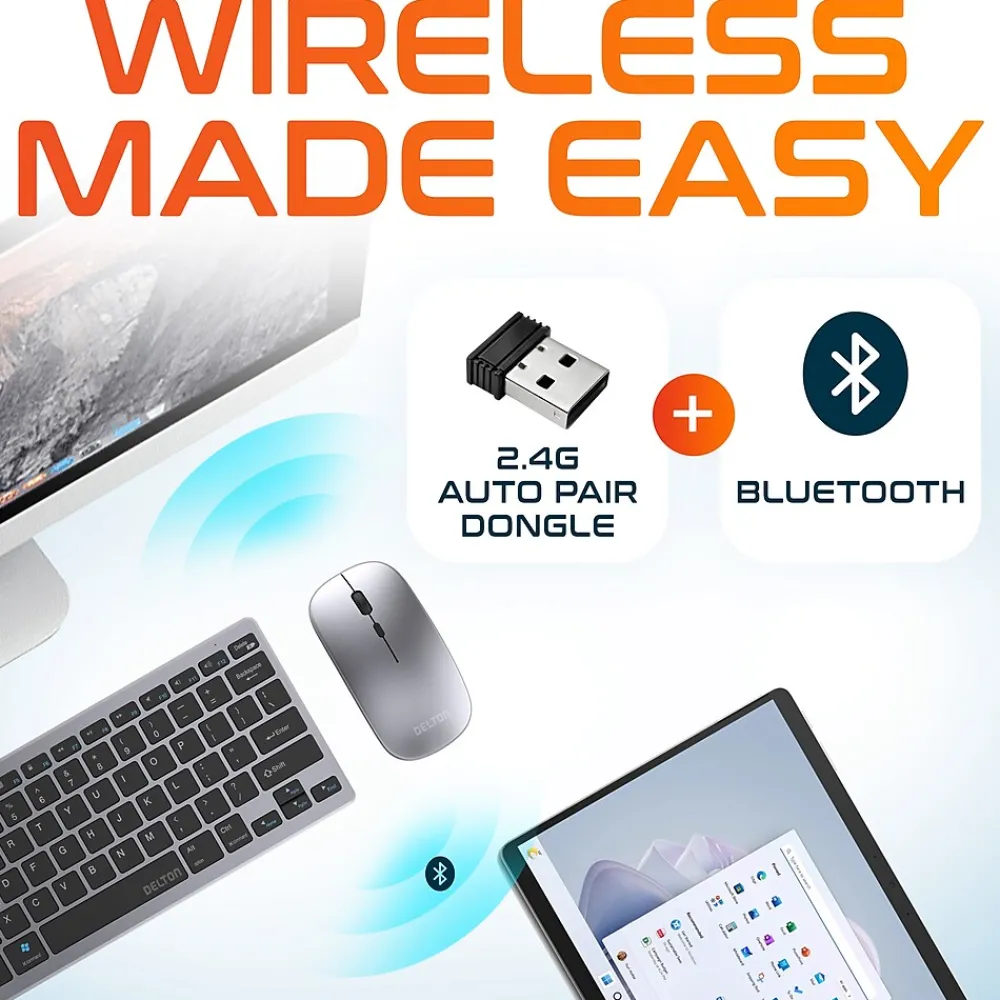 Streamline your workflow with outstanding versatility and comfort using this compact wireless keyboard and mouse combo from Delton. Compatible with Windows, macOS, iOS, Linux, Android and more, the combo offers Bluetooth and 2.4GHz auto-pair USB dongle options for steadfast wireless connectivity. Navigate with ease using the 12 multimedia function keys, and enjoy the liberty of a 30′ range. This slim wireless keyboard and mouse combo brings instant wake-up activation and a handy battery life indicator, ensuring you’re always prepared for work, play, and everything in between without ever missing a beat. Featuring a slim and compact design, this small wireless keyboard and mouse combo is great for small desks, offices and homes, enhancing modern spaces efficiently. The wireless keyboard is engineered with an auto power-saving mode, smooth keystrokes for a more comfortable typing experience, and a slim profile for a streamlined workspace. The slim wireless mouse boasts three dpi settings for personalized precision and a smooth scrolling, all while offering up to 15 months of long-lasting battery life. Perfect for the professional seeking a seamless, quiet, and efficient computing experience.