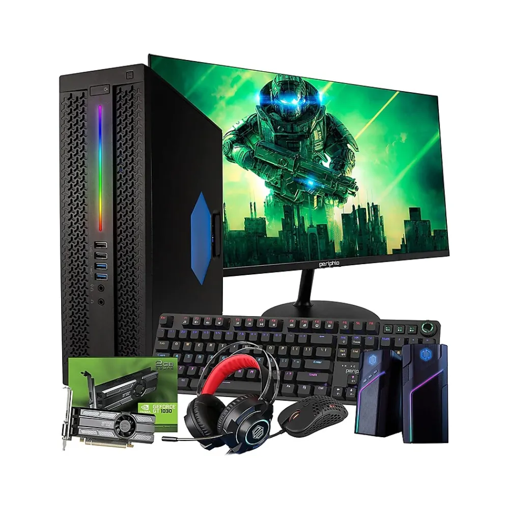 - Includes a 24″ LCD monitor (with cables), RGB mechanical keyboard and mouse, RGB computer speakers, an RGB headset, XXL Periphio desk mat, and power cord for immediate setup
