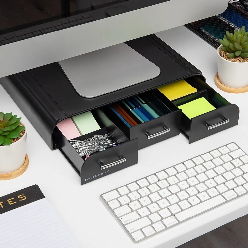 Experience the benefits of an ergonomic monitor stand designed to improve posture, reduce neck and shoulder pain, and elevate your monitor to a comfortable eye level for optimal viewing. This monitor stand not only helps reduce muscle and neck strain but also frees up valuable desk space for increased productivity. Featuring six removable legs with rubber feet for stability and an attractive design, this stand includes a built-in desk organizer with three drawers, offering ample storage for office supplies. Made from high-quality plastic, it is strong, durable, and easy to clean for daily use. Measuring 13.5 x 13 x 4.25 inches and weighing 2.42 lbs, this monitor stand can hold a variety of monitor sizes and weights up to 22 lbs. Easily movable and versatile, it makes a great gift for students, those with small spaces, or people who enjoy traveling. Complete your workspace with other Anchor Collection products for a cohesive, organized look.