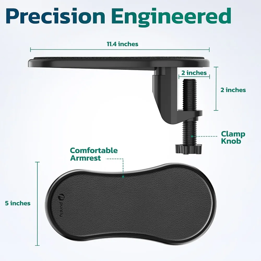 Elevate your comfort with the Purely E5620 ergonomic computer arm rest, designed to deliver optimal support and alleviate wrist strain. Computer arm rest support is an ergonomic design that maintains proper wrist alignment, reducing fatigue during long computer sessions. Enjoy customizable comfort with the 180° adjustable feature, tailored to your needs. This adjustable arm rest offers quick installation, ensuring you can set up your wrist support swiftly and easily, with no tools required. Equipped with sponge padding that adapts to your wrist, it offers plush comfort. The armrest pads anti-slip design keeps it firmly in place, while the lightweight, portable construction makes it easy to carry and handle. Perfect for home office use and travel, this armrest extender ensures ergonomic relief wherever you go. The breathable fabric keeps your hands cool and dry, and the durable build withstands daily use. Ideal for health-focused consumers and companies prioritizing employee well-being, the elbow rest truly cares about your comfort and health at work. After proper installation, this armrest supports up to 11 lbs (5kg).