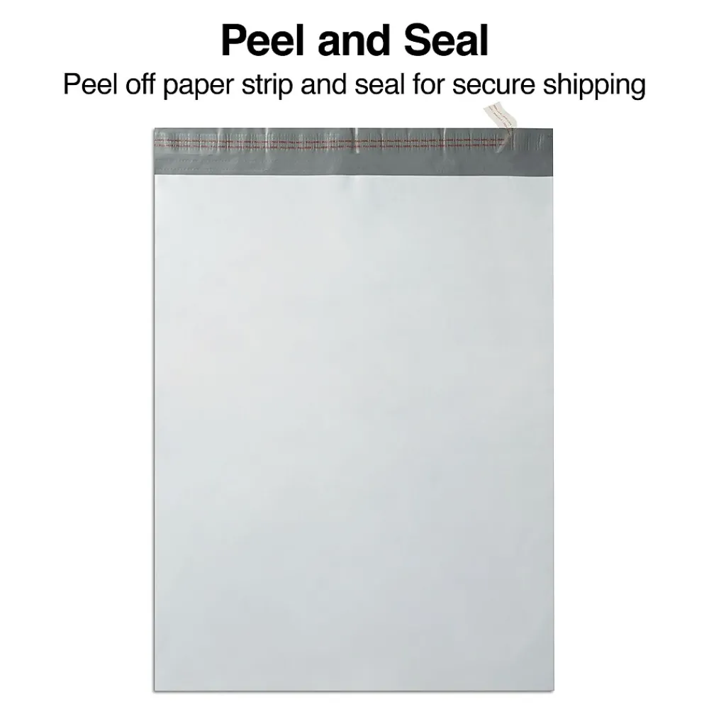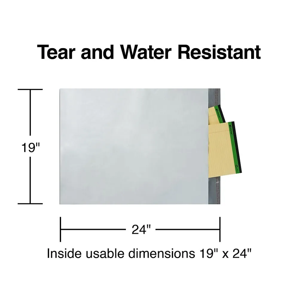 Keep items dry during transport in these water-resistant poly mailers. The smooth surface is easy to write on and accepts labels and stamps. These pouches have crisp white exteriors that make writing easy to see and are tear-resistant, helping ensure the contents stay intact. The spacious design of these Staples 19 x 24-inch poly mailers accommodates items ranging from documents to clothing, ideal for retail operations.