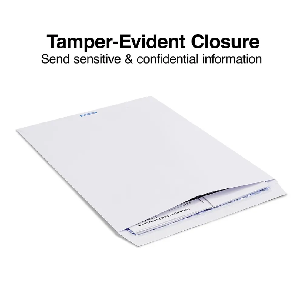 Keep private information confidential with these Staples EasyClose tamper-evident security-tinted catalog envelopes. Each envelope has an adhesive strip on the flap that makes it easy to seal contents inside, while the security tint and tamper-evident features help ensure that sensitive information is not read by third parties. These Staples EasyClose tamper-evident security-tinted catalog envelopes are built with 28-pound wove paper for durability.