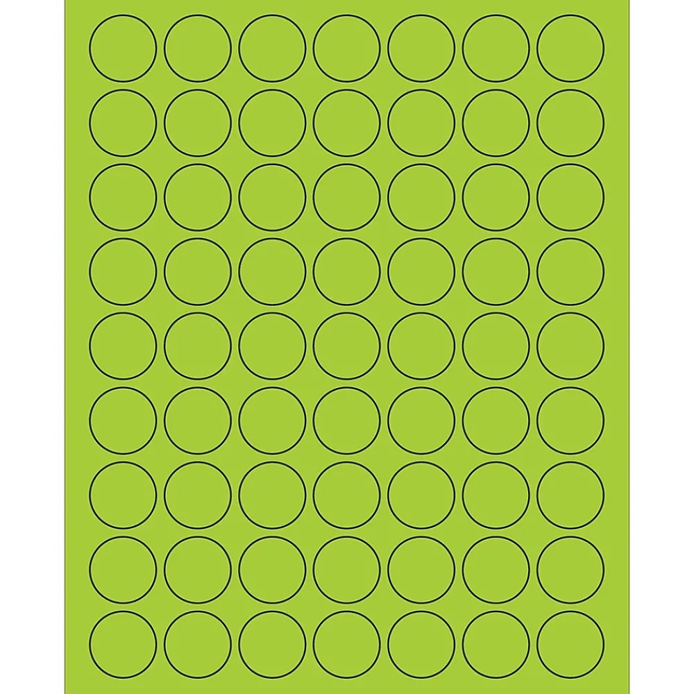 1″ Fluorescent Green Circle Laser Labels. Use to create your own product or mailing labels. Labels work with both Laser and ink jet printers. Permanent adhesive. Labels stick to a variety of smooth surfaces including paper, corrugated, plastic, wood, glass and metal.