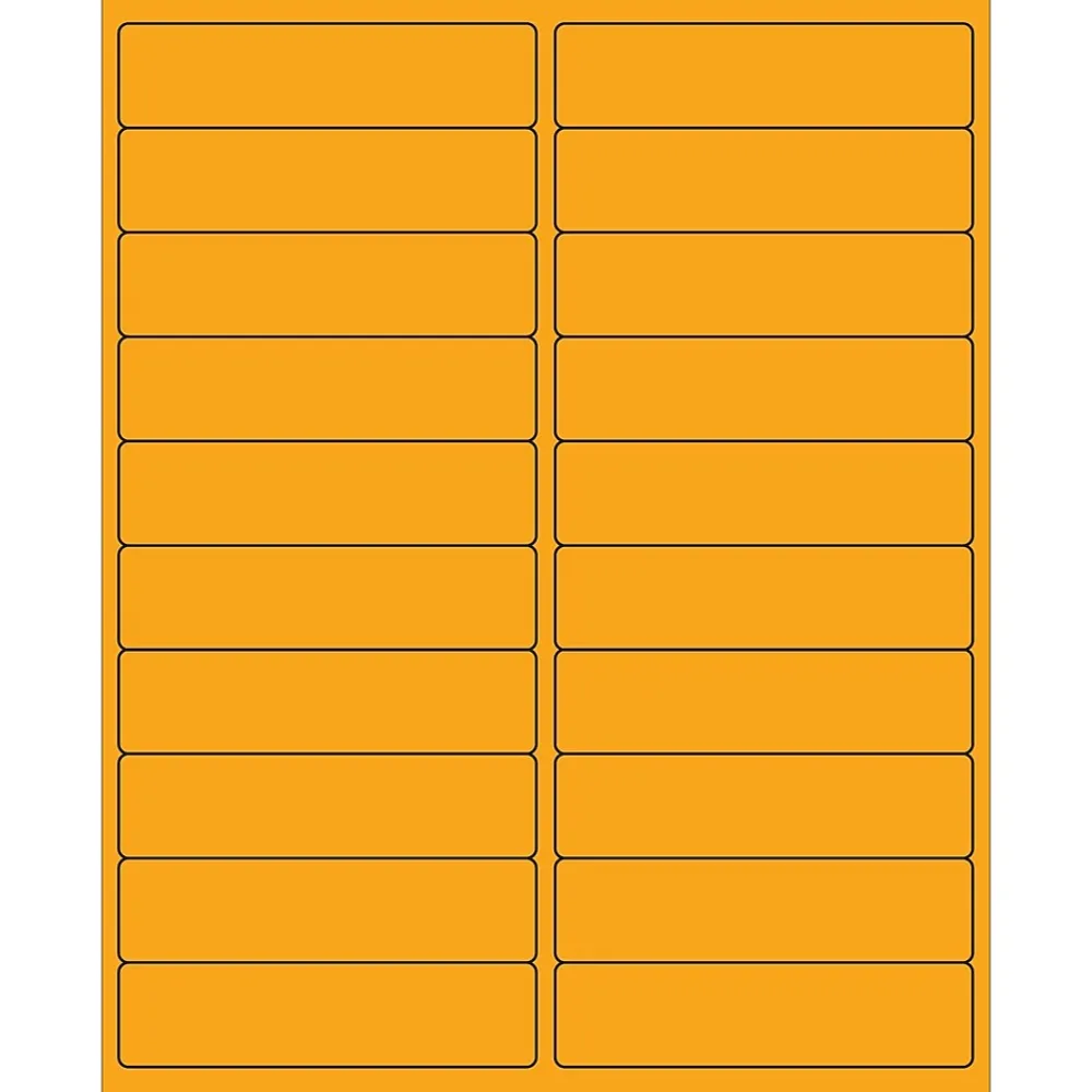4″ x 1″ Fluorescent Orange Rectangle Laser Labels. Use to create your own product or mailing labels. Labels work with both Laser and ink jet printers. Permanent adhesive. Labels stick to a variety of smooth surfaces including paper, corrugated, plastic, wood, glass and metal.