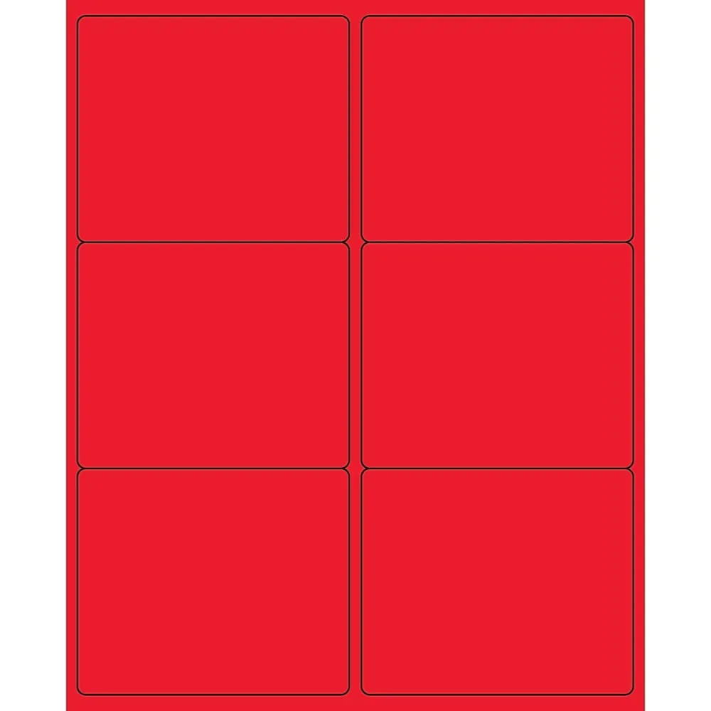 4″ x 3 1/3″ Fluorescent Red Rectangle Laser Labels. Use to create your own product or mailing labels. Labels work with both Laser and ink jet printers. Permanent adhesive. Labels stick to a variety of smooth surfaces including paper, corrugated, plastic, wood, glass and metal.