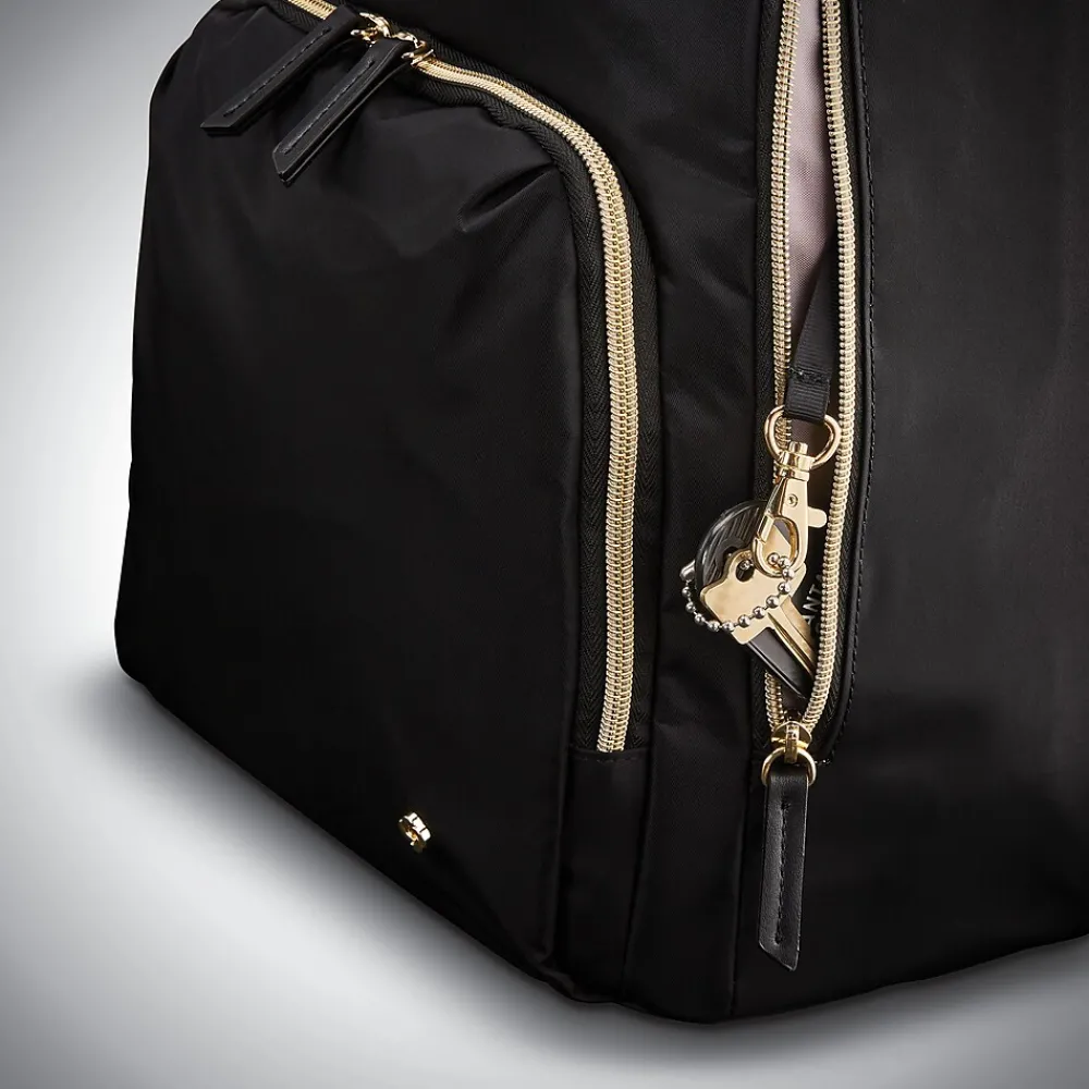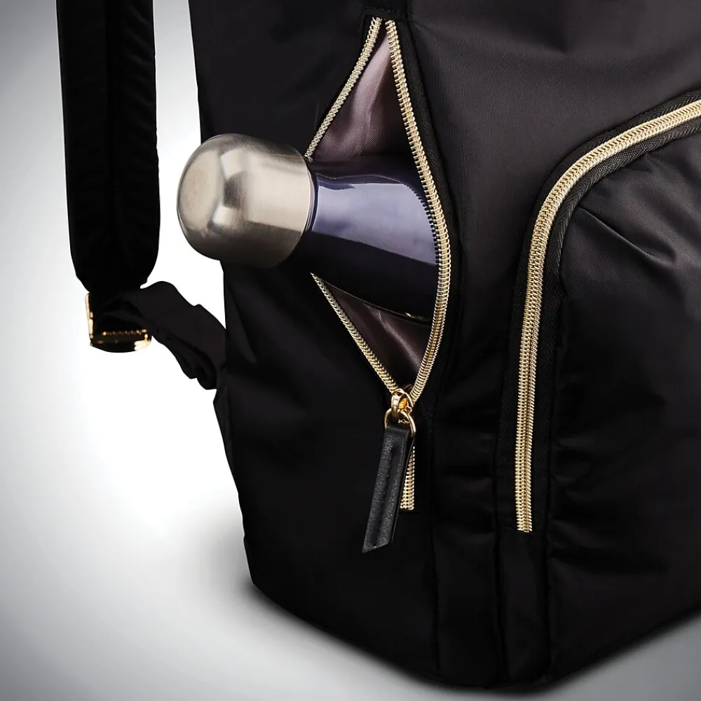 This Samsonite laptop backpack is made of water-resistant nylon material and features a padded laptop compartment and a tablet pocket. It also has a front organizer pocket, a side water bottle pocket, and a smart strap.