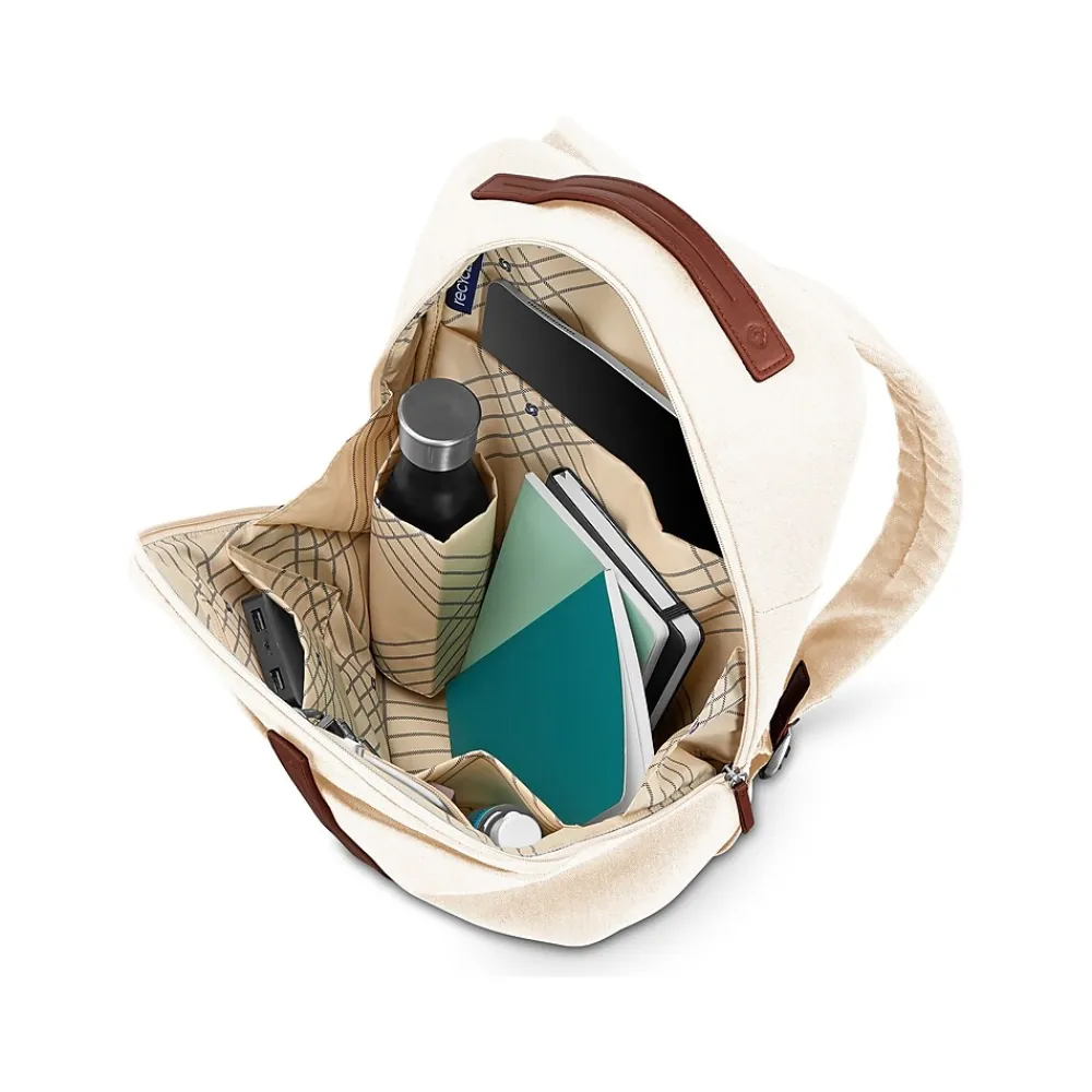 - This backpack is made of recycled RPET polyester and cotton blend; comes in off-white with brown PU accents