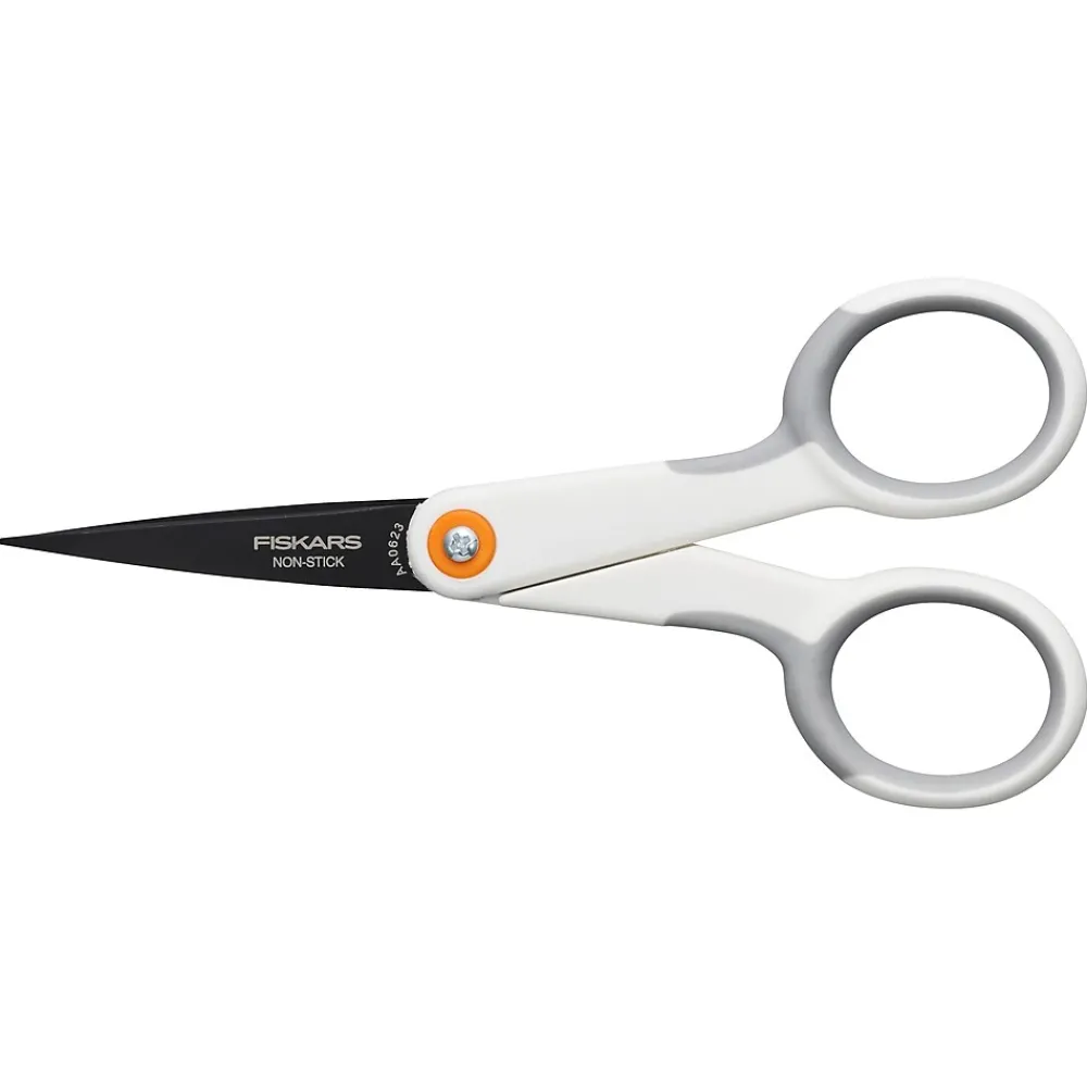 Fiskars® SoftGrip® Nonstick Scissors help to elevate your creativity by providing unique design and blade coating for intricate cuts on sticky materials. Micro-Tip® blades provide superior accuracy. Non-stick blade coating makes clean cuts through sticky materials that tend to gum up like tape, vinyl, stickers and glue. High-grade stainless steel blades are precision-ground to cut all the way to the tip. Double-loop SoftGrip® handle provides excellent comfort and control for right- and left-handed users.