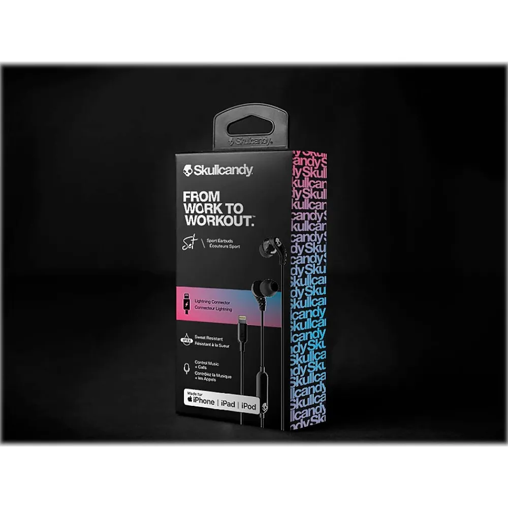 These Skullcandy sweat- and water-resistant earbuds with an in-line mic are great for sports and workouts. Their 9mm drivers are tailored for comfort and render detailed powerful sound.