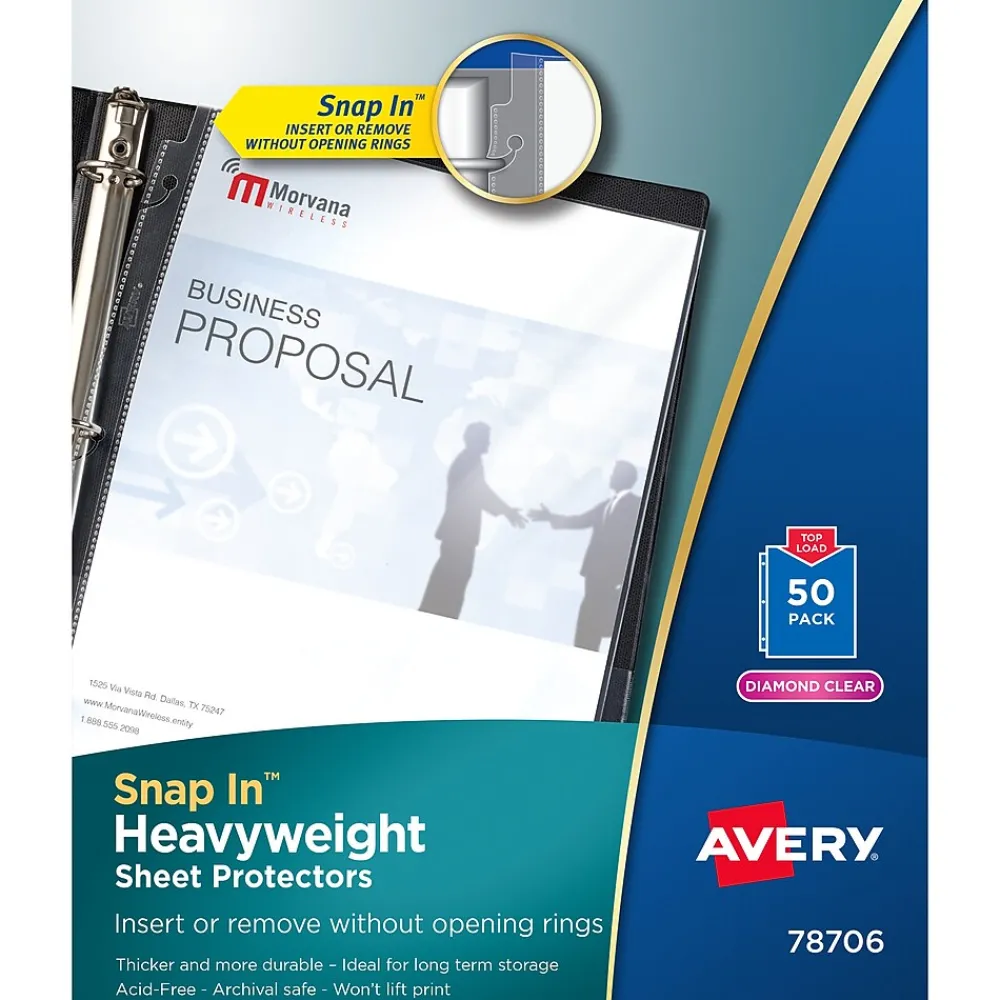Avery® Snap-in sheet protector is made of heavyweight, non-stick propylene material and is archival safe with no acid material. Sheet protector supports sheets measures 8 1/2″ x 11″ and offers secure sheet storage without any damage to print.