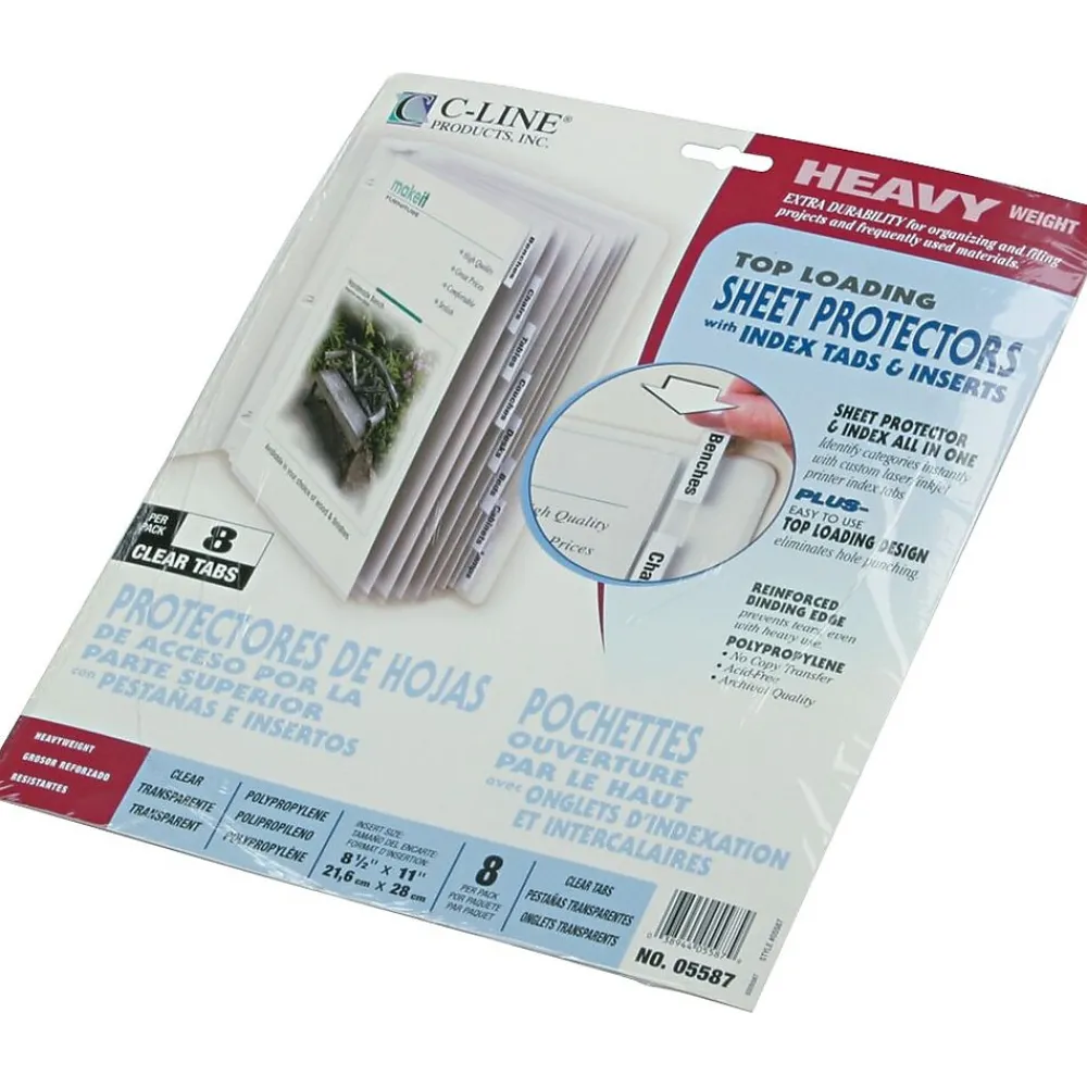 A top loading polypropylene sheet protector and index all in one! Now you don’t have to buy oversized indexes separately. Use to index ring binders. Eight clear tabs. Sheet protectors with index tabs are an excellent way to organize yourself instantly. Acid-free protection eliminates photocopy transfer. Includes laser/inkjet printable tabs. Insert size: 11x 8 1/2. 8/ST.