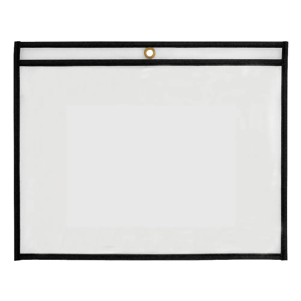 11 x 8 1/2″ Job Ticket Holders. Store and protect work orders, production papers and inventory cards in these Job Ticket Holders. Taped and stitched black edges provide added strength and extended product life. Provides protection while allowing easy visibility of documents. Clear both sides. Convenient metal eyelet at top for hanging.