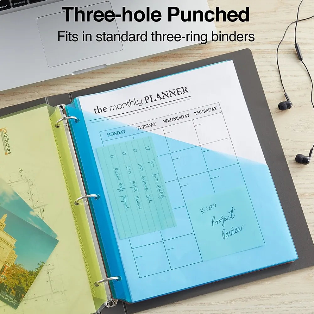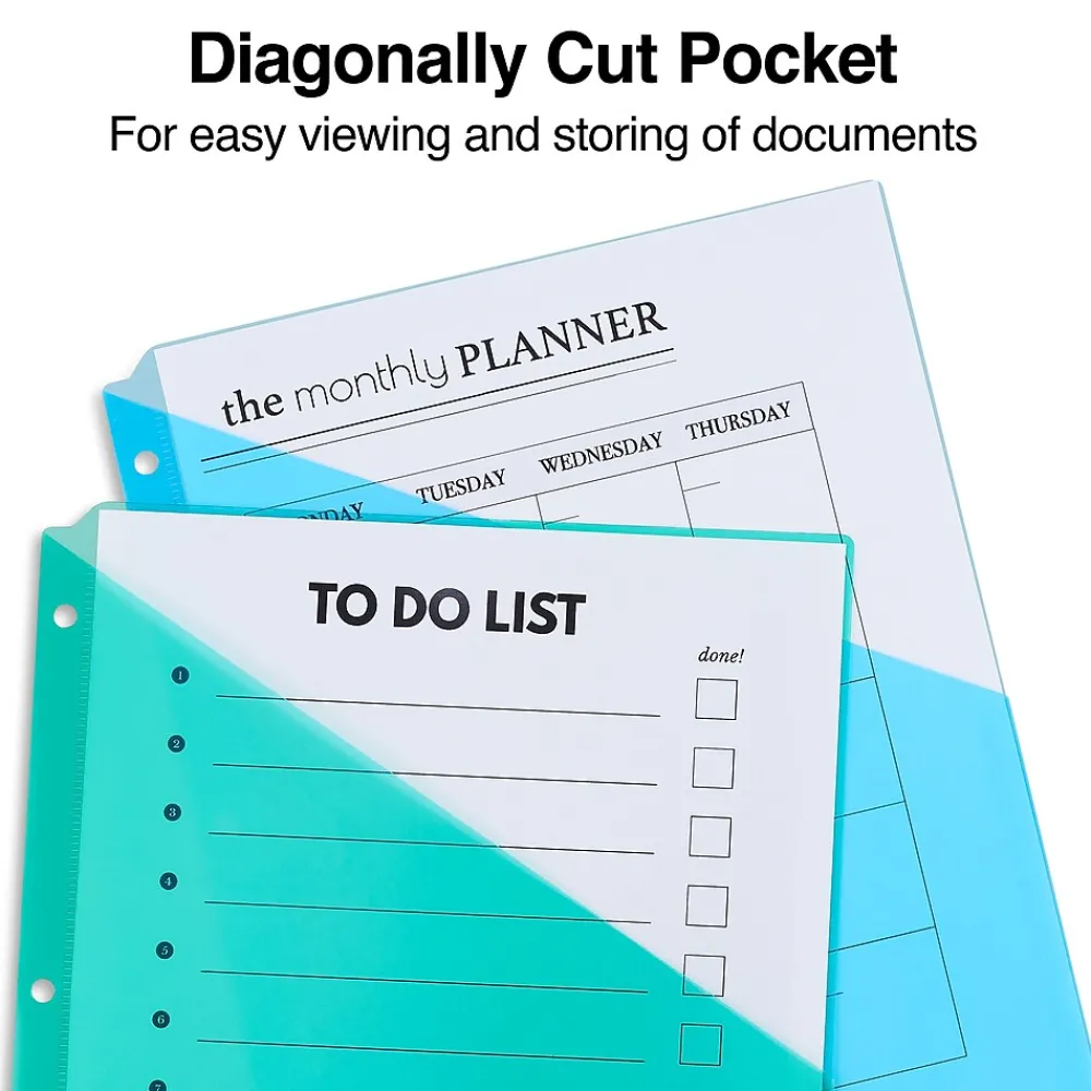 Separate different sections of presentations into easily identifiable segments with these binder pockets. Each pocket fits up to 70 sheets of paper, making these dividers ideal for storing important paperwork that can not be hole punched. Available in assorted colors that make it easy to differentiate the sections of a document, these Staples binder pockets are three-hole punched, allowing them to fit into any standard three-ring binder.
