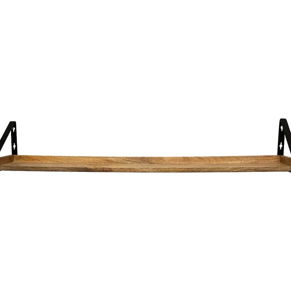 This Eden Grove Shelving real-wood ledge with metal brackets has a smooth surface with rounded edges and an even tapered style. The sturdy metal brackets enhance the ledge and are simple to install. The finish of the real wood varies in color due to the nature of the natural material. The look of reclaimed wood is part of the trendy accent this ledge will make to your home or office.