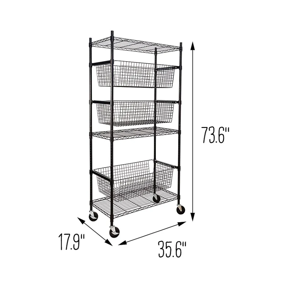 - Heavy-duty shelves hold up to 200 lbs. each, while deep baskets hold up to 40 lbs. each