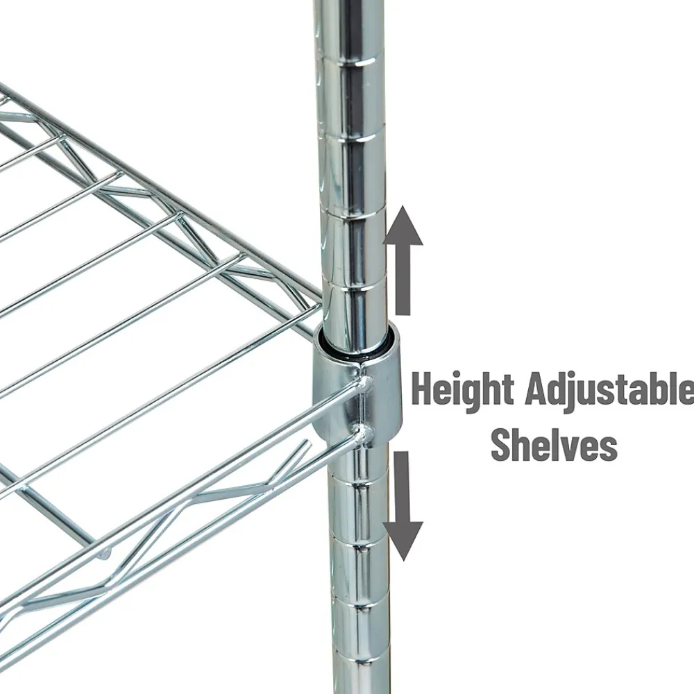 This industrial-strength adjustable storage shelving system is a versatile solution to help keep your spaces organized and clutter-free. Perfect for the kitchen, bathroom, garage, and even commercial spaces like restaurants and offices. The shelves are fully adjustable at 1-inch (2.5 cm) increments, allowing for the storage of a wide range of items, from large boxes to dishware.It’s easy assembly requires no screws or tools. Constructed with steel and coated with a chrome finish, it’s designed to resist rust, corrosion, and wear and tear, ensuring long-lasting durability.Despite its lightweight design at only 10.25 pounds (4.65 kilograms), each shelf can support an impressive 200 pounds (90.7 kilograms) of weight, offering robust storage capacity.This freestanding shelving system is an excellent choice for various settings. In commercial environments like restaurants or hotels, it offers reliable storage. It’s also ideal in office break rooms for storing dry goods, bathroom supplies, and toiletries. For home use, it’s perfect in the kitchen for storing small appliances or pantry items. With its versatility and durability, it’s a valuable addition to any space.