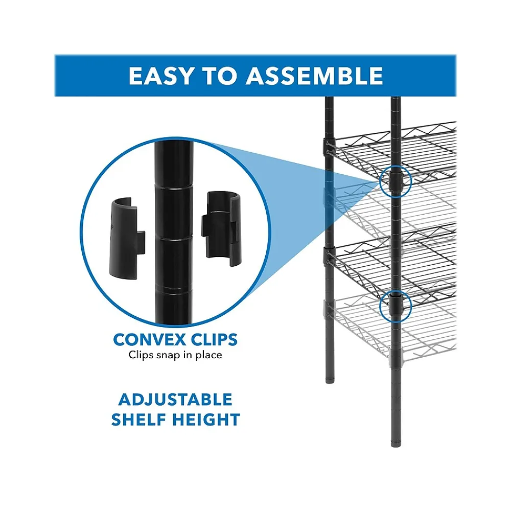 The Mount-It! five-tier metal shelving unit is the perfect metal storage rack for offices, kitchens, garages, laundry rooms, bathrooms, and bedrooms. With spacious shelves and a carrying capacity of 88 lbs. per shelf, this five-tier metal shelving unit can hold a plethora of items like office supplies, food, toiletries, and boxes. If you have larger items that are tall you can easily rearrange and adjust the shelf height in order to fit your larger items. There is no better solution to simple storage than Mount-It! storage shelves with adjustable feet.