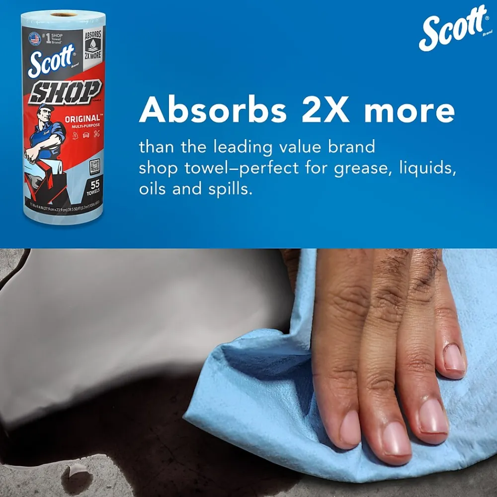 Scott® Shop Towels Original™ are made by Scott®, the #1 Shop Towel Brand. These blue shop towels absorb 2X more than the leading value brand paper towel for your everyday jobs. Scott® Shop Towels Original™ are soft, absorbent and can be used for cleaning up oil spills, changing oil, refilling fluids and other general automotive maintenance. They can also be used to absorb large liquid spills and leaks, routine cleaning and maintenance and removing soils and liquids from face and hands (not for use on compromised skin). Available in a roll format or Pop-Up™ Box with a built-in handle, these perforated, cloth-like towels are portable for on-the-go jobs. Whether you own an automotive garage, are a DIY weekend warrior or working around the house, trust none other than the original blue shop towel, Scott® Shop Towels Original™, made by Scott®, the #1 Shop Towel Brand (Circana, Retail Tracking Service, U.S. sales, 2021 & 2022.)