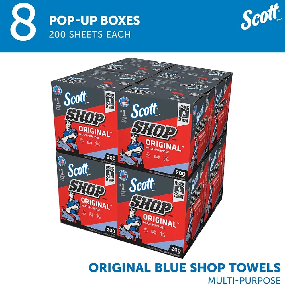 - 200 Towels/Box; 8 Boxes of Scott® Shop Towels Original™/Case; 1,600 Towels/Case; Original Blue Shop Towels; 9″x12″ sheets; Pop-Up™ Box