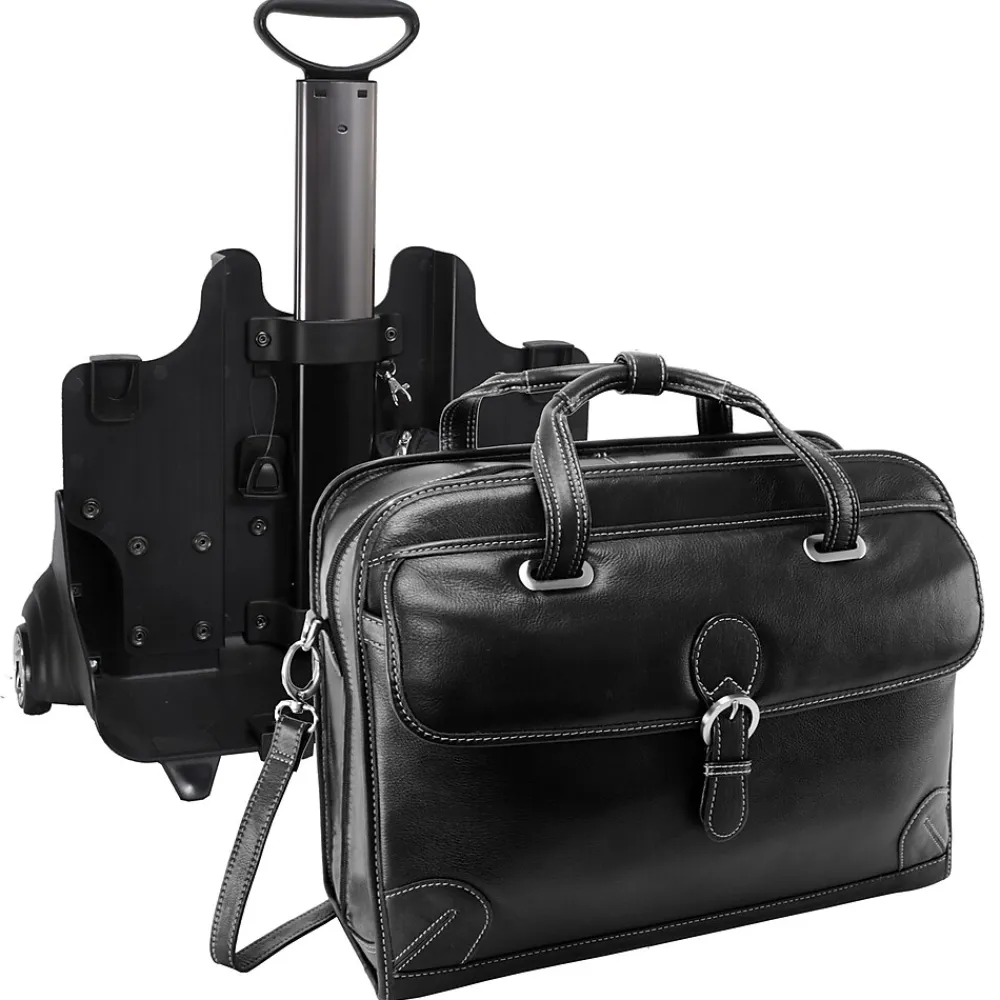 Patented 2-in-1 Removable Wheel and Handle System briefcase with quick, accessible front pocket with a magnetic clasp for files and accessories.