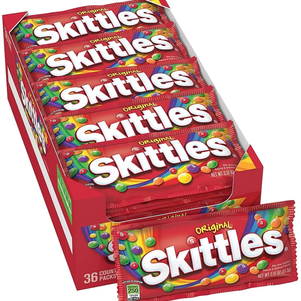 SkittlesĀ® 2.17 oz Original fruit flavored candy is made of fruit juice with amplified flavors that include lime, grape, lemon, orange, strawberry, artificial and natural savors. Chewy candy is a great snack for moviegoers, sold as 36 bags per box.