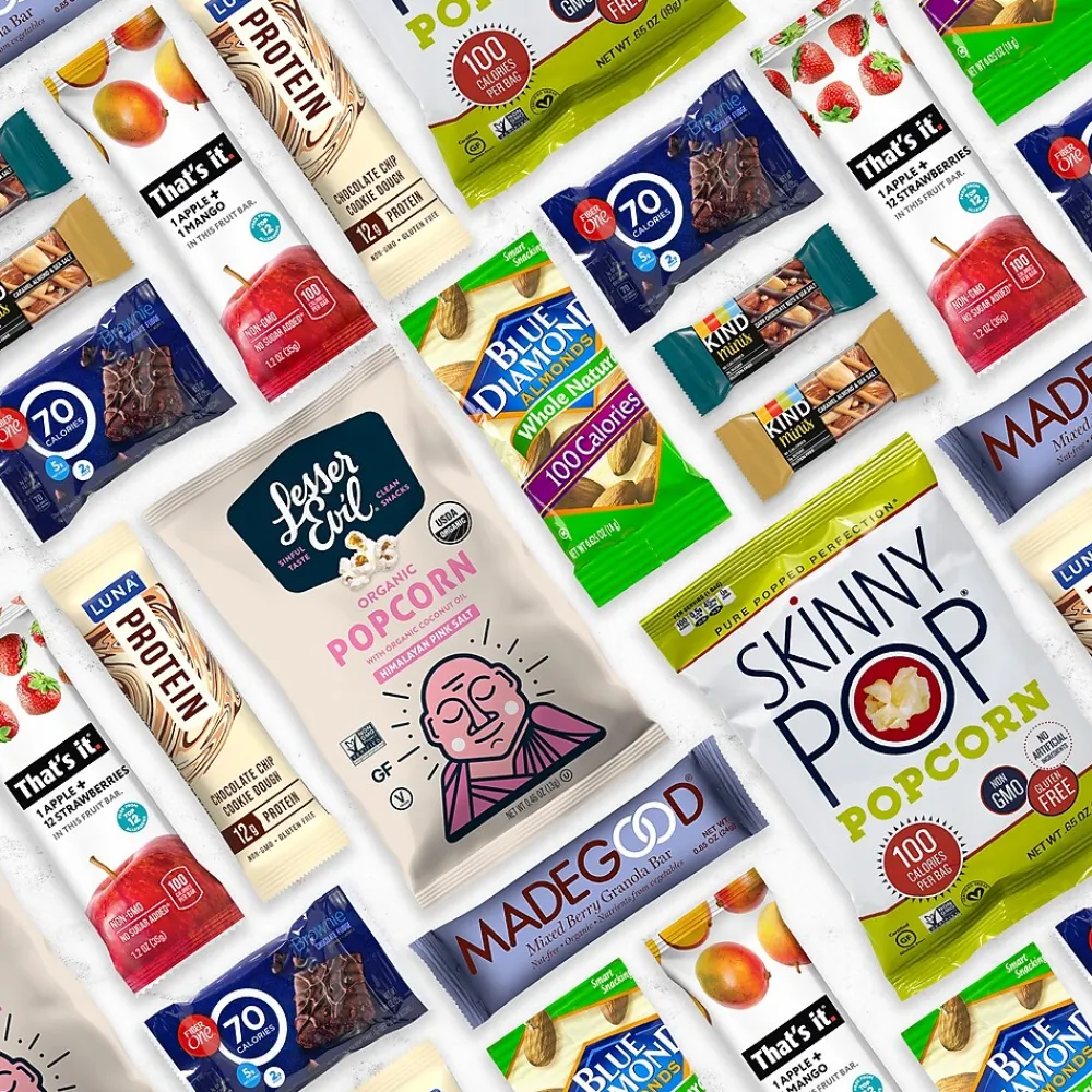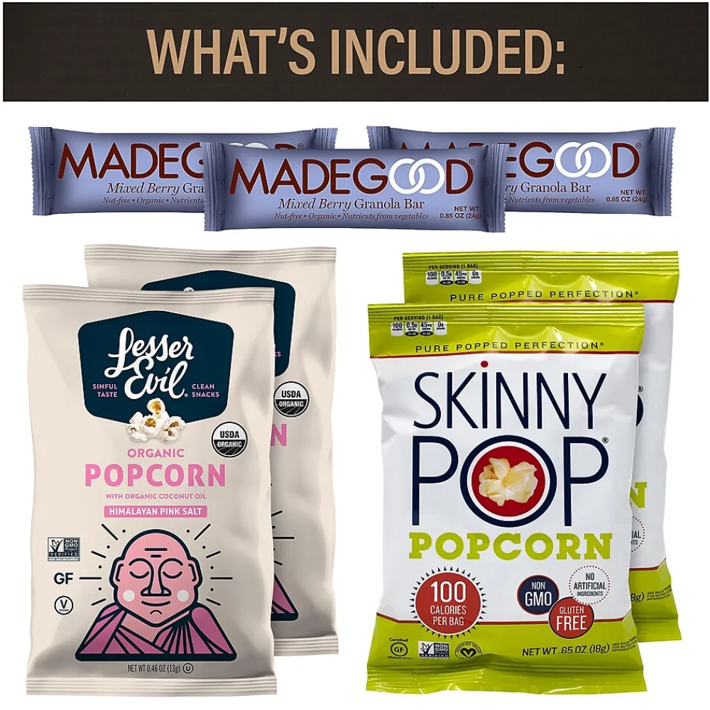- A total of 28 items and brands such as Skinny Pop, Lesser Evil, Luna, KIND, Fiber One, Made Good, Blue Diamond, and THAT’S IT.