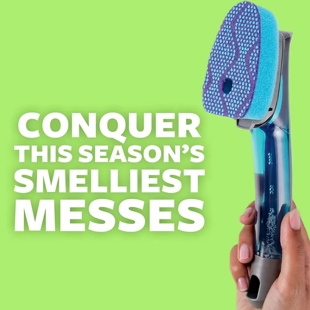 Keep your dishes clean and your hands out of the water with the Scotch-Brite Soap Control Non-Scratch Scrub Dots Dishwand, from America’s No. 1 selling dishwand brand. This long-lasting dish sponge with soap dispenser handle features 3x the scrubbing power* to take down everyday messes with ease. Offering precise soap control with the push of a button, this dish scrubber dispenses the right amount of dish soap exactly where and when you need it. Say goodbye to soap spills for good thanks to the leak-free guarantee and innovative valve that keeps dish soap from leaking, no matter how you store your scrub sponge wand. The soft-touch surface provides a non-slip grip, and the built-in scraper helps remove stuck-on foods. This non-scratch cleaning sponge is safe to use on dishes, non-stick cookware, countertops, tubs and showers, and more. Plus, it resists odors and rinses clean – even eggs and cheese won’t stick to this easy-to-clean kitchen sponge with handle. Just fill it with your favorite dish soap, and effortlessly wipe away grease and grime. The Scotch-Brite Soap Control Non-Scratch Scrub Dots Dishwand is durable, reusable and top shelf dishwasher safe, with scrubbing fibers made from 75% recycled content.