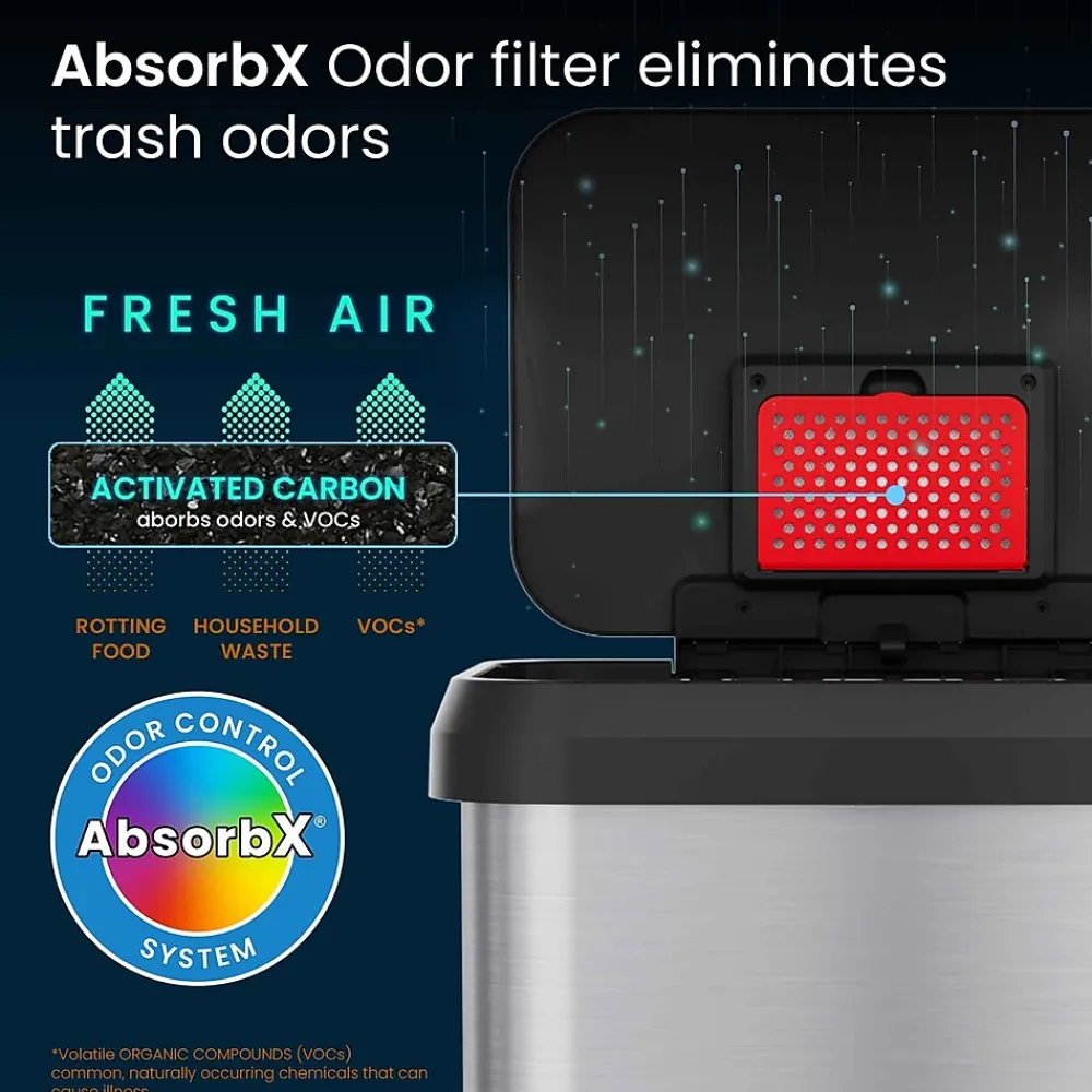 This iTouchless SoftStep EXP trash can is made with elegant, fingerprint-proof stainless steel body and dent-proof ABS plastic lid. It features smooth, easy pedal operation and silent, gentle lid close. Trash bag retainer rim prevents a full bag falling in and keeps bag ends neatly out of view. Extra-large 20 gal. capacity holds lots of trash.