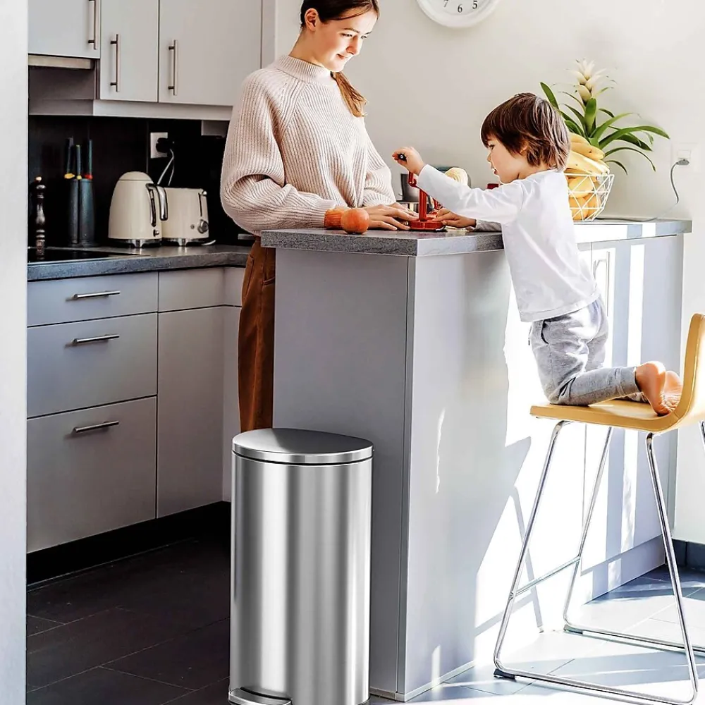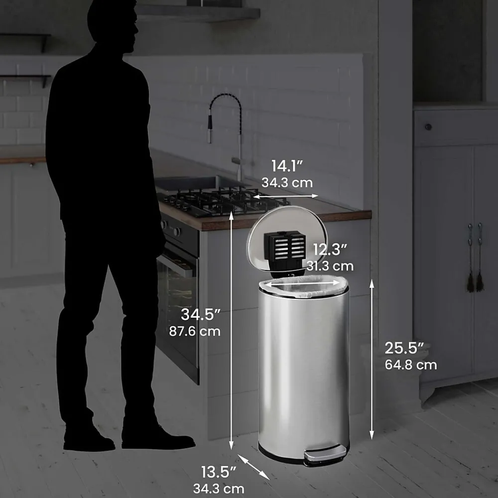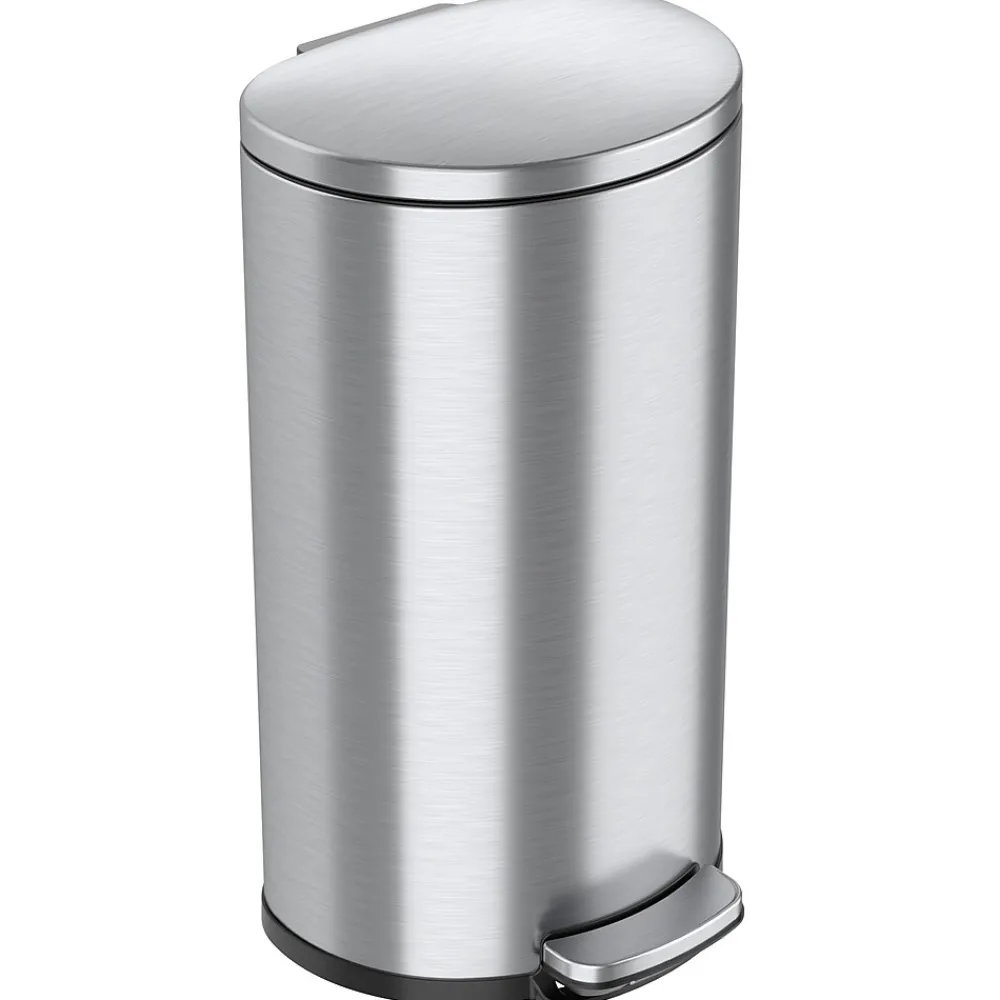 This iTouchless SoftStep trash can features a versatile semiround shape and space-saving design that make it perfect for the kitchen. The can is made of elegant fingerprint-proof stainless steel and comes with an AbsorbX natural carbon odor filter.