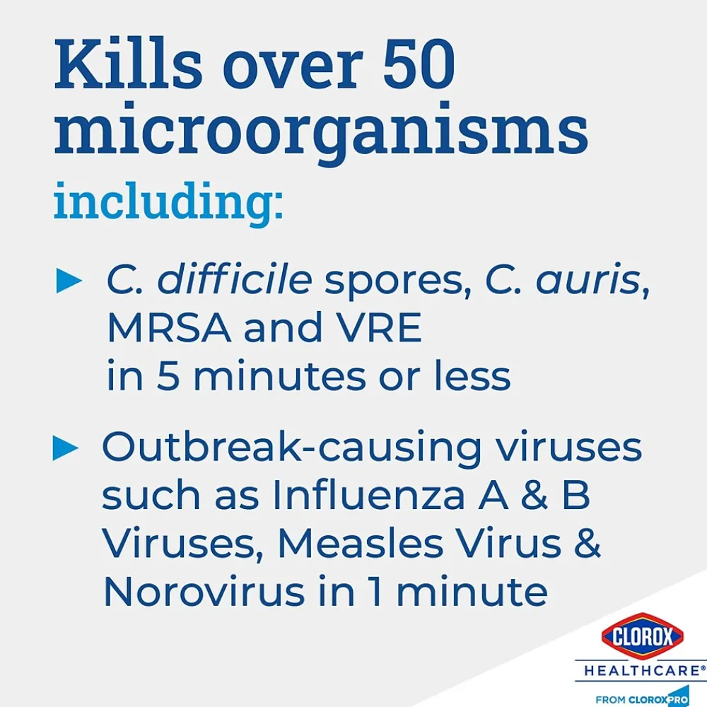 Clorox Healthcare Spore Defense is your low odor, easy on surfaces cleaner disinfectant for facility-wide use. It is intended for use with kills 45 microorganisms including C. difficile spores in five minutes and Bactericidal, Virucidal and Fungicidal in one minute. This Spore Defense cleaner meets EPA criteria for use against SARS-CoV-2, the virus that causes COVID-19. The closed system bottle designed for use with the Clorox Total 360 Electrostatic Sprayer. This one step cleaner disinfectant is compatible with a wide variety of surfaces including acrylic, chrome, aluminum, plastic, vinyl, glazed porcelain, PVC, plastic and stainless steel. Use this spore cleaner for floors, bed frames, infant incubators, showers, stretchers, wheelchairs and more. Most surfaces require spraying until thoroughly wet to meet contact times, let air-dry and then wipe clean. Ideal for use in clinics, doctor offices, emergency rooms, hospitals, patient rooms and more.
