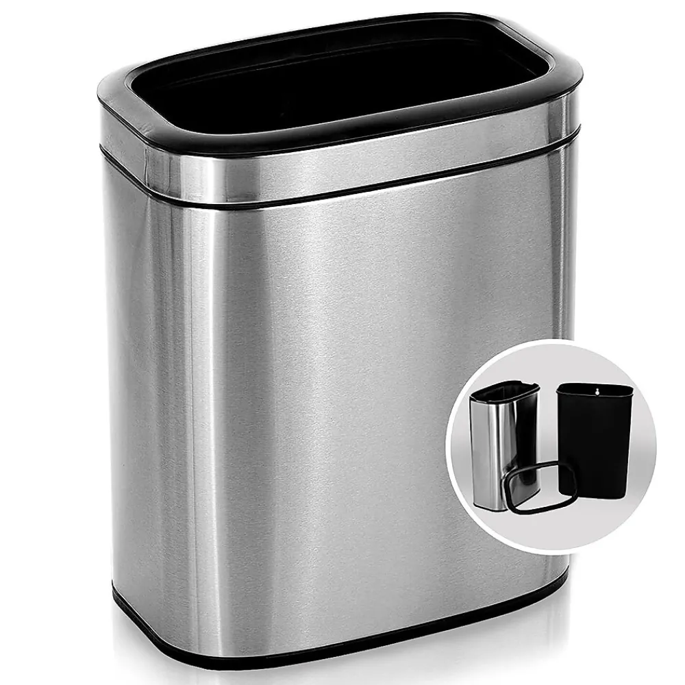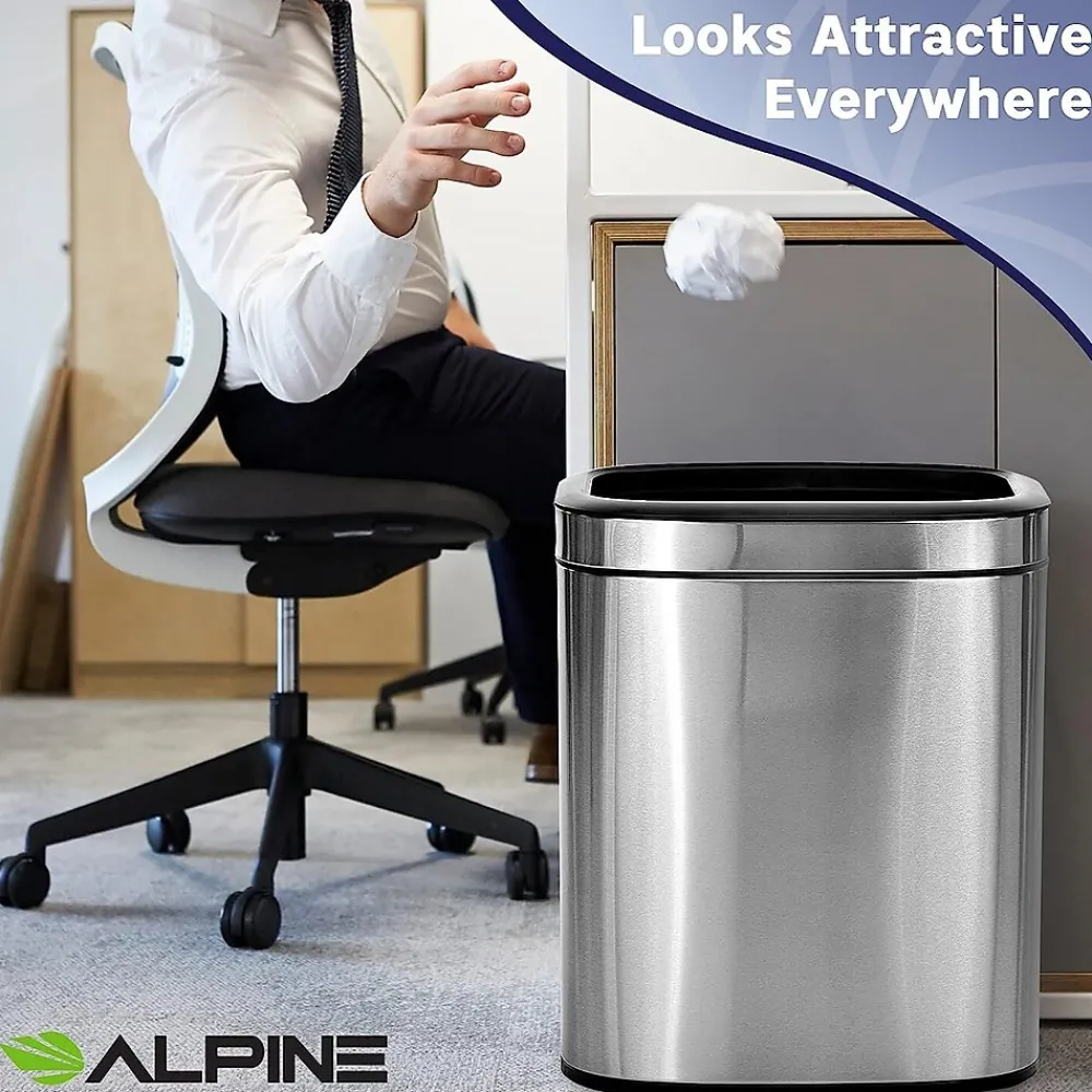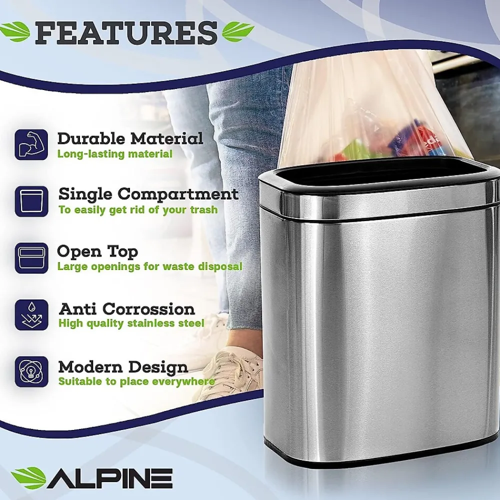 Alpine Industries 5.3 Gal. Stainless Steel Rectangular Liner Open Top Trash Can is not just a waste bin, it’s also an additional source of style and decor that’s suitable in any environment, with it’s slim design and brushed stainless steel finish. Featuring a large diameter opening for waste disposal access, this stainless steel trashcan will keep your space clean of rubbish and make it simple for trash disposal on the go. It includes a rigid black plastic liner to easily remove trash and dump into trash bags or large disposals. Constructed of durable and antimicrobial stainless steel for long-lasting use. Set of 2.