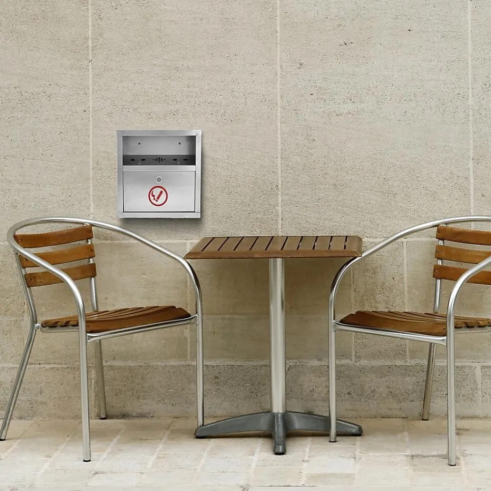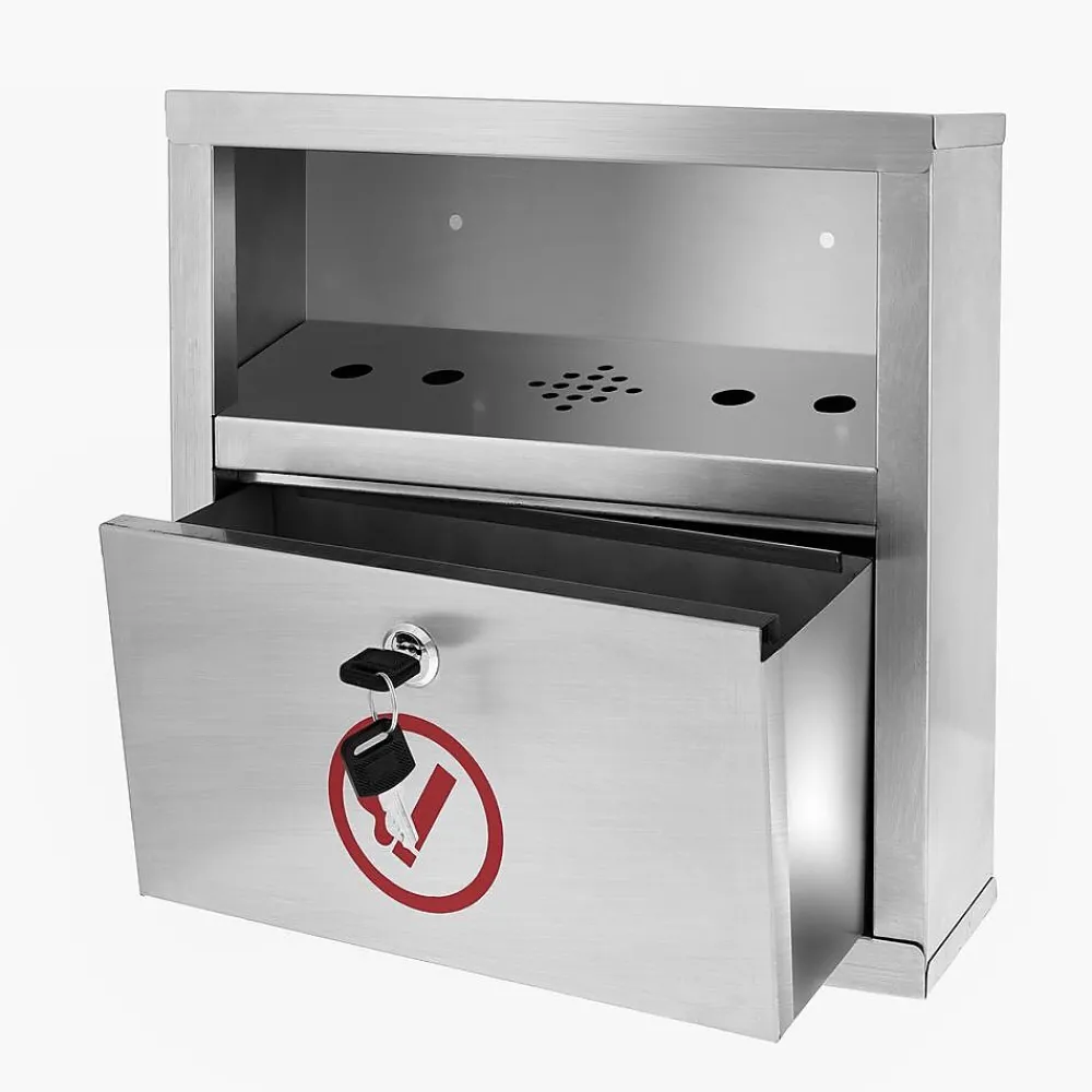 The Alpine Industries Quick Clean Wall Mounted Cigarette Disposal Station is the perfect solution to reducing litter in public areas and at entrances to smoke-free facilities. Discarded butts fall through 4 access holes into the galvanized steel interior bin with baffle opening that provides extra protection from weather. Emptying the bin via a lock-equipped door mounted with a piano hinge for long-term reliable performance in any outdoor environment. The bin is durably built with a rugged, 4 pound stainless steel housing to provide long-term durability and use year after year. Not only can the material stand up against daily wear and tear, it can also withstand harsh environmental conditions. Discarded butts fall through the four access holes into the galvanized steel interior bin, while the baffle opening provides added protection from rain and snow. Furthermore, numerous vent holes help to eliminate the unpleasant odors of smoldering smoke. When full, emptying the bin is quick and simple. For easier content removal – as well as long-term, reliable performance in any outdoor environment – this quick-clean bin includes a lock-equipped door with unit-wide, stainless steel piano hinges. Finally, this 9 pound cigarette litter box comes complete with mounting hardware and can be easily installed onto most surfaces. It features a compact design that measures 12.2 in H x 5.8 in W x 4.2 in D for minimum intrusion into space, and is furnished in an easy-to-incorporate stainless steel finish that will complement and enhance any exterior design
