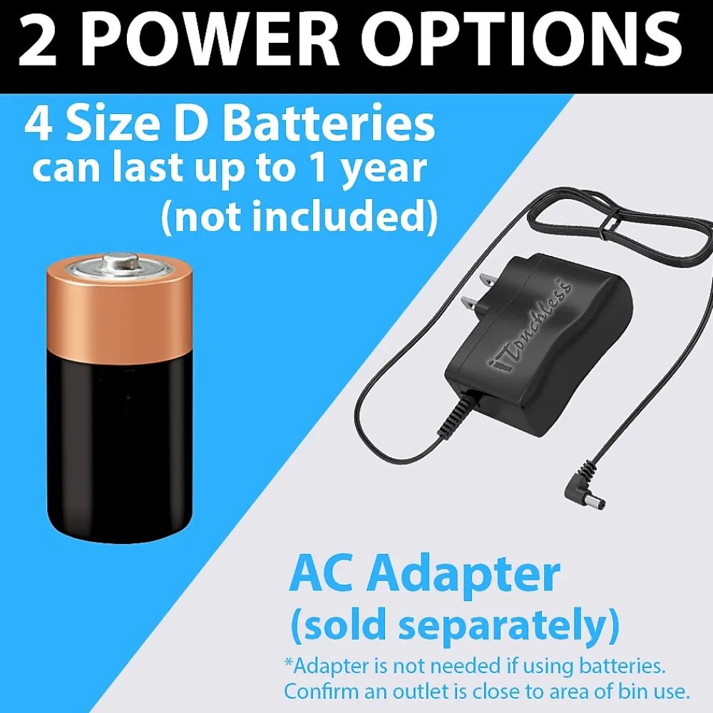 - Sensor-activated, automatic lid. High-quality ABS plastic. Powered by4 D size batteries (not included) or AC Adapter (sold separately).